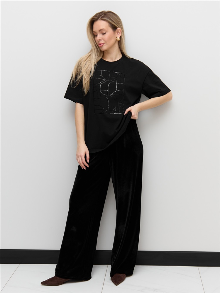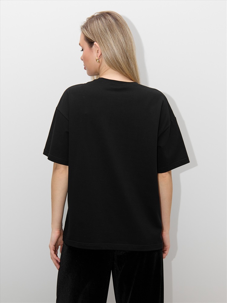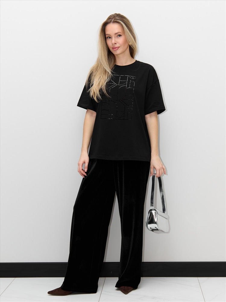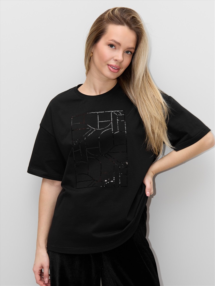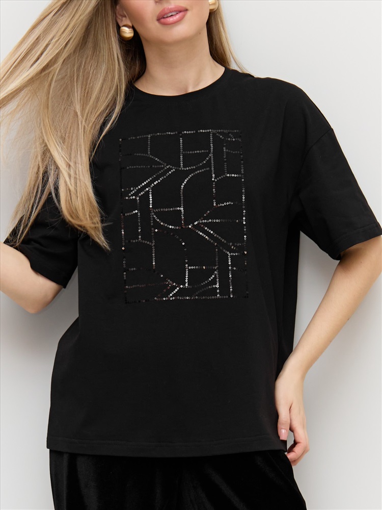 Ткань: Кулирка с лайкрой Футболка женская из гладкокрашенного трикотажного полотна «кулирка с лайкрой», свободного покроя, с короткими втачными рукавами, горловиной овальной формы, обработанной втачной планкой. По центру полочки выполнена вышивка «пайетками» в тон изделия.