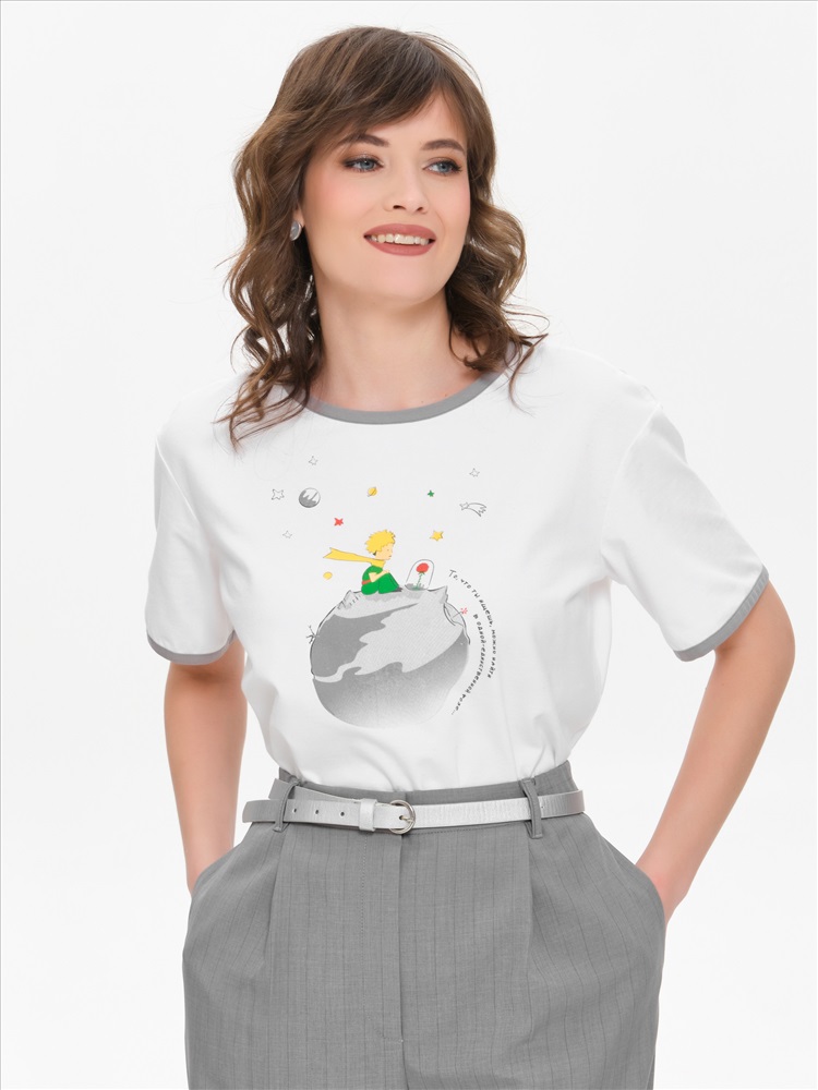 Футболка оверсайз белая с принтом от фабрики Priz. Модель прямого кроя, выполнена из трикотажа. Футболка со спущенным плечом. Низ рукава и вырез горловины окантованы. Комфорт и стиль на каждый день., Оттенок цвета и расположение рисунка могут незначительно отличаться от фото., Ожидание отправки (рабочих дней): 7, Размер модели: 44., Рост модели: 164 см., Состав:, Хлопок 97%, Эластан 3%, Тип ткани:, Трикотаж