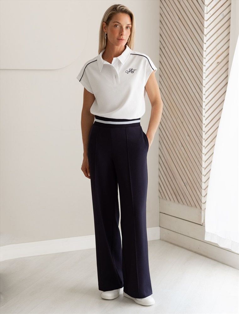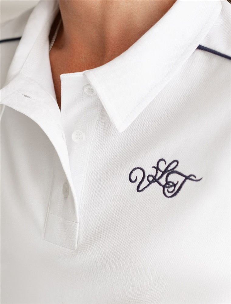 Состав: 92%Хлопок 8%ПУ Футболка-поло выполнена из фактурного трикотажа. Модель с цельнокроеным рукавом дополнена вышитым логотипом и контрастными полосками из основного полотна по плечам. Свободный силуэт подходит для любой фигуры, хорошо смотрится в заправку с брюками и юбками теннисной коллекции. Идеально с джинсами в повседневном аутфите.