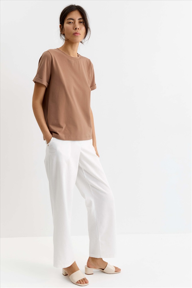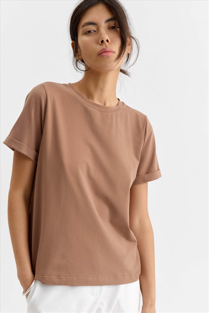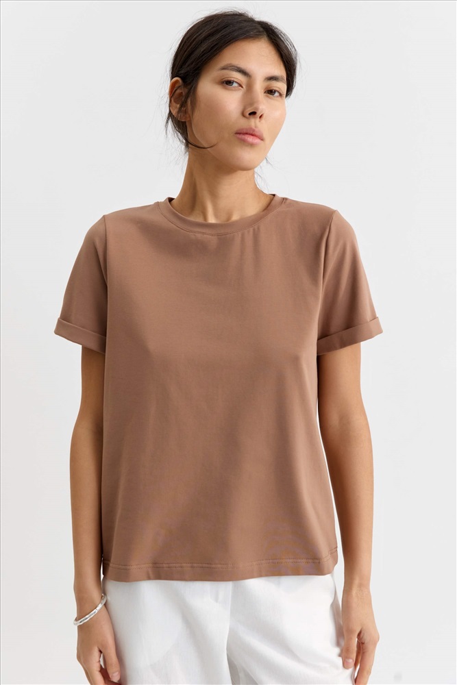 Состав: 95% Хлопок 5% Эластан Длина: 55 см. (42 размер), 60 см. (52 размер) Цветовая гамма: Какао Силуэт: Полуприлегающий Принт: Нет Коллекция: Весна #2 Базовая футболка из трикотажа. Модель полуприлегающего силуэта. Короткий втачной рукав. Горловина обработана бейкой. Комментарии к товару