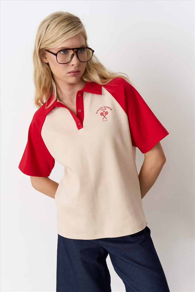 Состав: 95% Хлопок 5% Эластан Длина: 65 см (42 размер), 68 см (52 размер) Цветовая гамма: Бежевый/красный Силуэт: Свободный Принт: Да Коллекция: Лето #4 Футболка из интерлока в ретро-стиле. Модель свободного силуэта с воротником-поло на пуговицах. Рукав реглан. Комментарии к товару