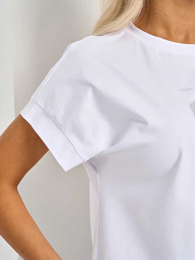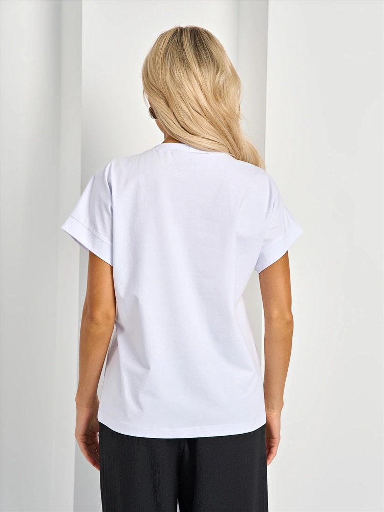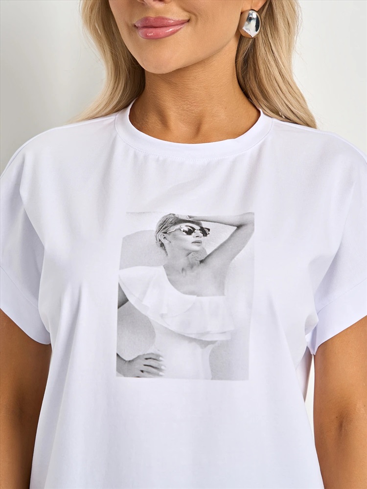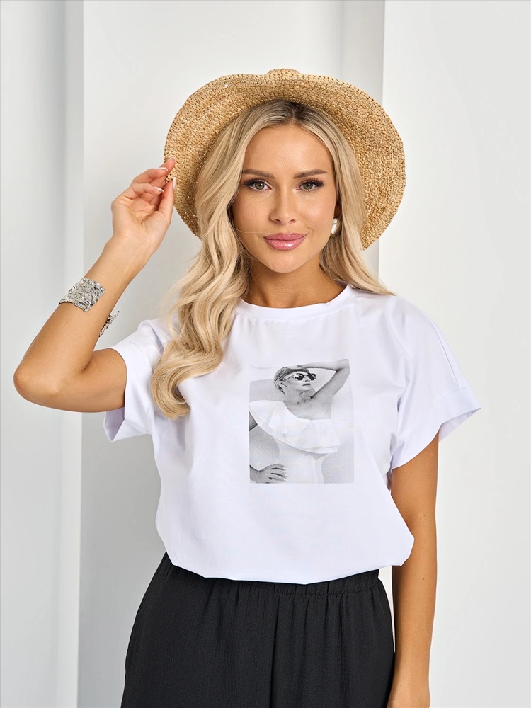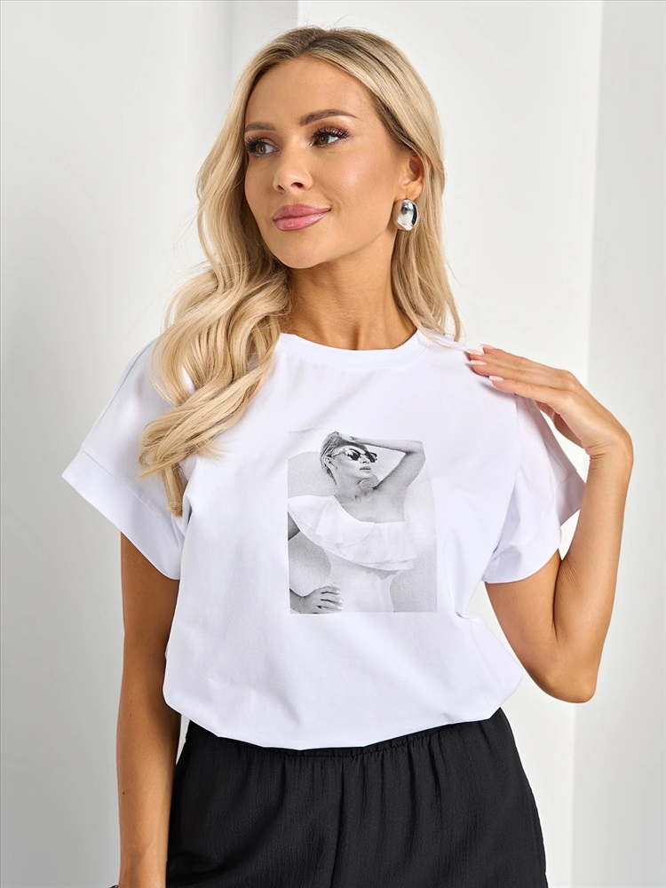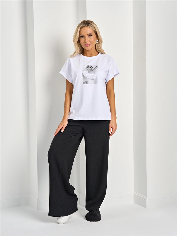 Круглый вырез горловины. Короткий цельнокроеный рукав. Перед изделия декорирован печатным принтом. Комментарии к товару