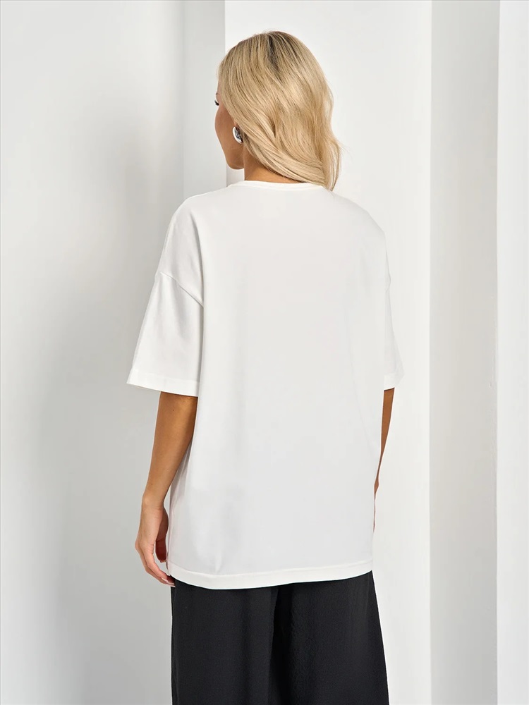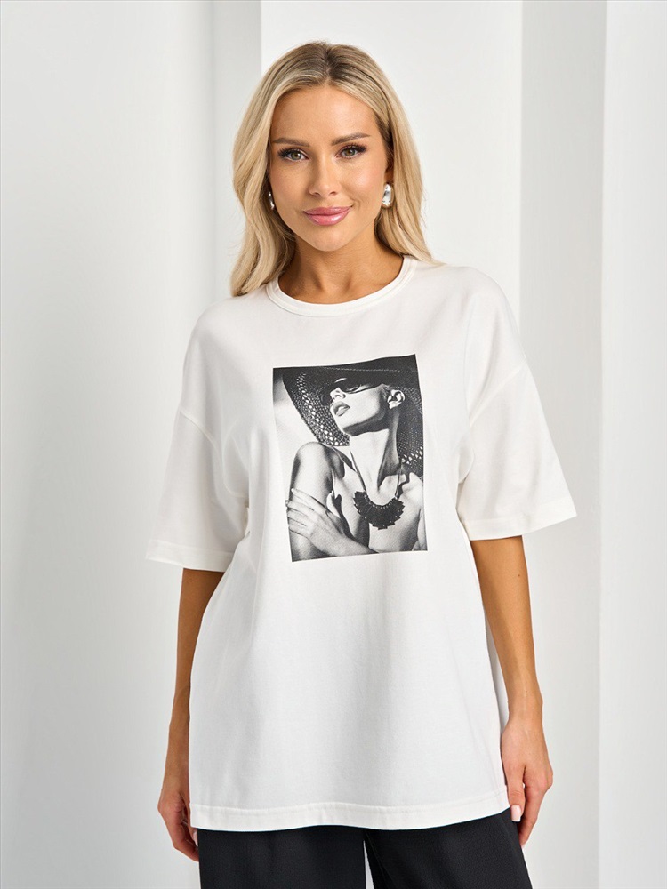 Футболка трикотажная белая с принтом, от компании Jetty. Модель свободного силуэта, с округлым вырезом горловины. С короткими втачными рукавами. Линия плеча спущена. Прекрасный вариант для любого мероприятия., Оттенок цвета и расположение рисунка могут незначительно отличаться от фото., Размер модели: 40., Рост модели: 170 см., Состав:, Хлопок 95%, Эластан 5%, Тип ткани:, Трикотаж