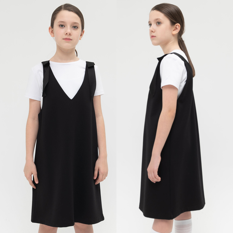 Состав: 60%вискоза 35%полиамид 5%эластанОписание: Модный сарафан школьный для девочки из мягкого трикотажа. Универсальная школьная форма для девочек и девушек. Свободный А силуэт выгодно смотрится на любой фигуре и не стесняет движений школьницы. Детский трикотажный сарафан для подростков имеет глубокий вырез на переде и спинке. Позволяет надеть на любую одежду для школы: футболку, блузку, водолазку, а при желании надеть школьный фартук или накинуть любую верхнюю одежду или пиджак. Идеально смотрится как нарядный, праздничный или классический повседневный сарафан для детей на лето, домашнее платье миди. Этот школьный сарафан имеет фишку, лямки из репсовой ленты со складкой. Простое, но красивое дополнение к строгому стилю. Так, вещи и одежда для подростка никогда не станет скучной. Школьное черное платье на бретельках идеально для 1 сентября, последнего звонка и выпускного ученицы.