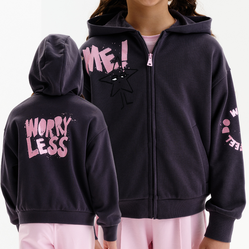 Состав: 87%хлопок 13%полиэстерОписание: Толстовка для девочки. Повтор модели сезона Весна’25, слегка обновлённый по длине и объёму — теперь сидит ещё комфортнее и современнее. Толстовка в расслабленном oversize-крое выполнена из хлопкового футера с небольшим добавлением полиэстера — ткань остаётся мягкой, практичной и хорошо держит форму. Центральная молния спрятана под напуском из основной ткани, на пуллере — фирменная буква P. Мягкое спущенное плечо, аккуратная пройма и одношовный капюшон создают стильный и аккуратный силуэт. Низ изделия и манжеты выполнены из плотной рибаны, высота манжет увеличена. Удобные прорезные карманы с листочкой. Длина — укороченная, с современным визуальным акцентом. В принте разноцветные блестки. Перевод спереди: мне, меня, мной. Перевод на рукаве: делай то, что чувствуешь. Перевод на спинке: беспокойтесь меньше.