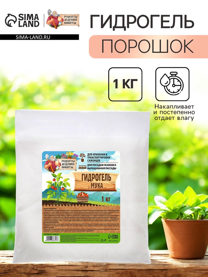 Гидрогель — это современный материал для накопления, удержания и последующей равномерной отдачи влаги. Гидрогель способен поглощать воду до 500 раз больше собственного веса. При смешивании гидрогеля с почвосмесью для комнатных и декоративных растений норма полива сокращается на 50–60 %, а при внесении в открытый грунт — на 20–40 %. Гидрогель не теряет своих свойств после полного высушивания и замерзания. По окончании срока годности гидрогель разлагается на углекислый газ, аммоний и воду.