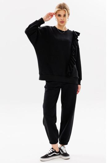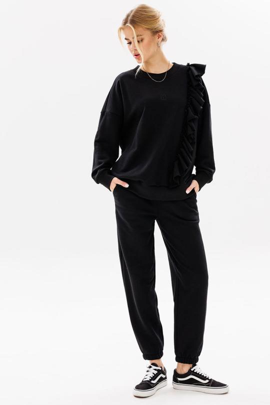 Современный, женственный костюм, покроя oversize из комфортной ткани (футера пенье). Костюм состоит из джоггеров и свободного свитшота с воланом. Волан с необработанным краем (укреплён строчкой для надежности) пришит асимметрично на левой стороне изделия. Свитшот имеет спущенную линию плеча, Брюки с притачным поясом, резинкой внутри. Передняя половинка брюк с удобными