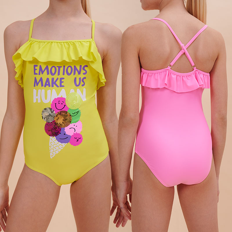 Состав: 80%полиамид 20%эластан, подклад: 100%полиэстерОписание: Яркий и модный слитный купальник для девочки. Модель с горизонтальным вырезом горловины подходит для девочек с любым типом фигуры. Тонкие и мягкие бретели не сползают, исключают трение и раздражение. На спинке бретели перекрещиваются, предусмотрена возможность регулировки длины. Детский купальник выполнен из полиамида и эластана — он прекрасно тянется, не теряя при этом своей формы, не выгорает и быстро сохнет. По верхней линии изделие украшено декоративным рюшем. По переду модель декорирована ярким позитивным принтом с пайетками в виде большого разноцветного мороженого, надпись переводится:"эмоции делают нас людьми". Принт эластичный и стойкий, отлично переносит многочисленные стирки. Модель представлена в двух трендовых неоновых цветах: розовый и зелёный. В линейке есть детские купальники следующих размеров: 3 (98): 4-5 (104-110): 6-7 (116-122): 8-9 (128-134): 10-11 (140-146). Купальник красивый подходит для девочек дошкольного, младшего школьного возраста и девочек-подростков. Отличный вариант для летнего отдыха, пляжа, моря и бассейна. Модный купальник — чудесный подарок дочери, внучке или сестре на любой праздник. Выбирайте нужный размер по таблице размеров на фото. Цвет товара на экране вашего устройства может отличаться от цвета изделия вживую. Товар возврату и обмену не подлежит.