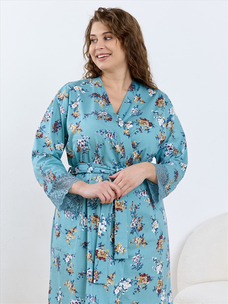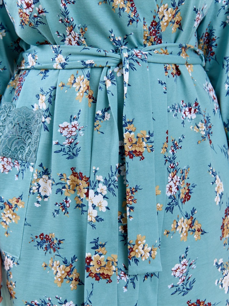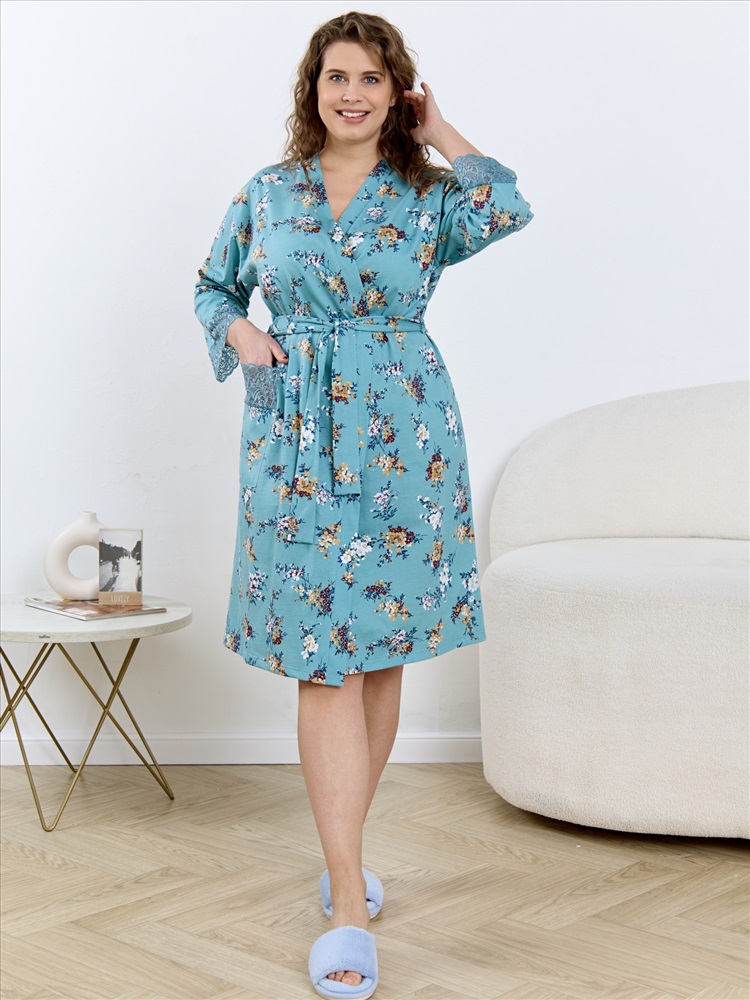 Халат женский из трикотажного полотна «кулирка» с набивным рисунком, на запахе, с втачными длинными рукавами, съемным поясам, продетым в две шлевки, вставленные в боковые швы на уровне линии талии. На правой полочке на уровне бедер – накладной карман прямоугольной формы. Борта и горловина обработаны притачной планкой. Верхний срез кармана и нижние срезы рукавов отделаны кружевом.