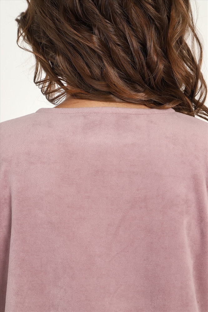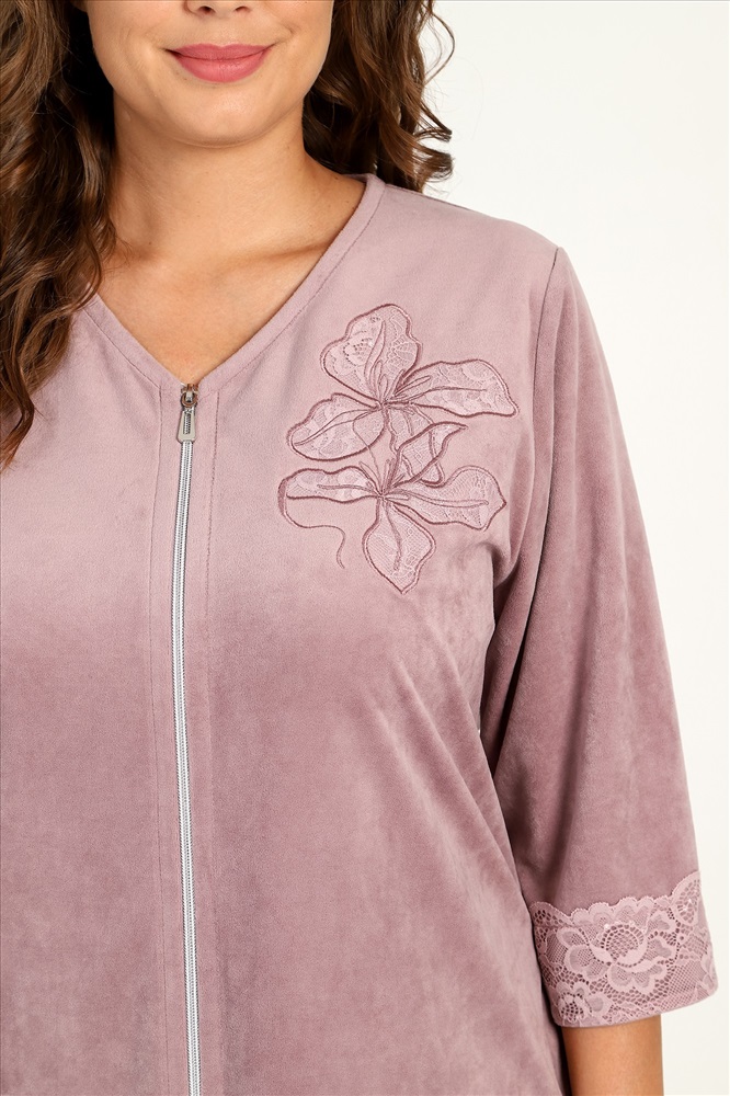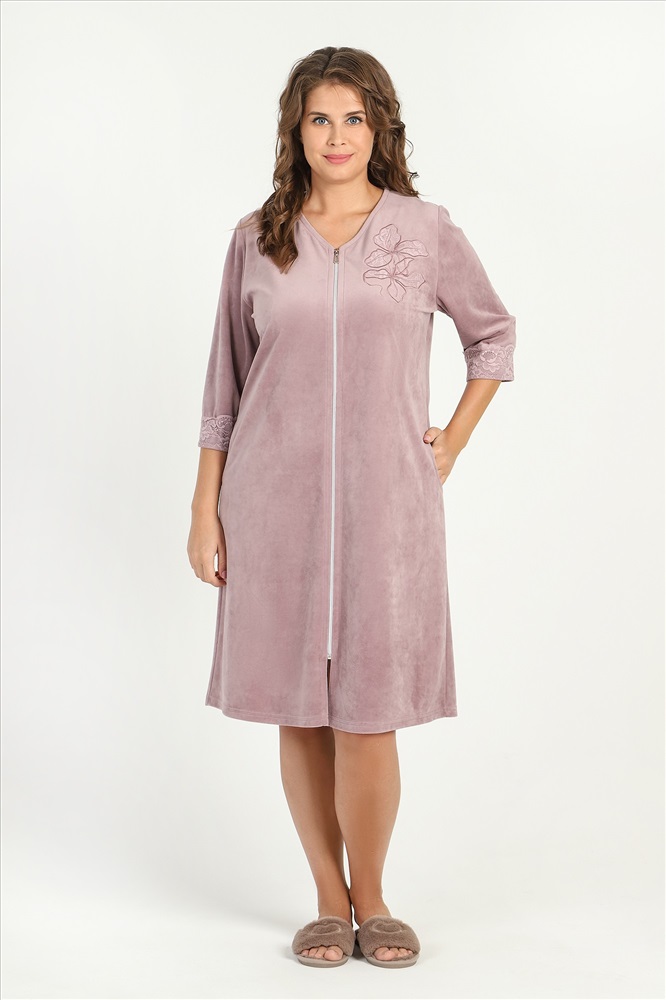 Ткань: Вельмонд Халат женский из трикотажного полотна «вельмонд», прямого силуэта, с втачными рукавами длиной ¾, карманами в боковых швах, горловиной v-образной формы, переходящей в центральную бортовую застежку на тесьму «молния», с вышивкой на левой полочке и отделкой широким кружевом по низу рукавов.