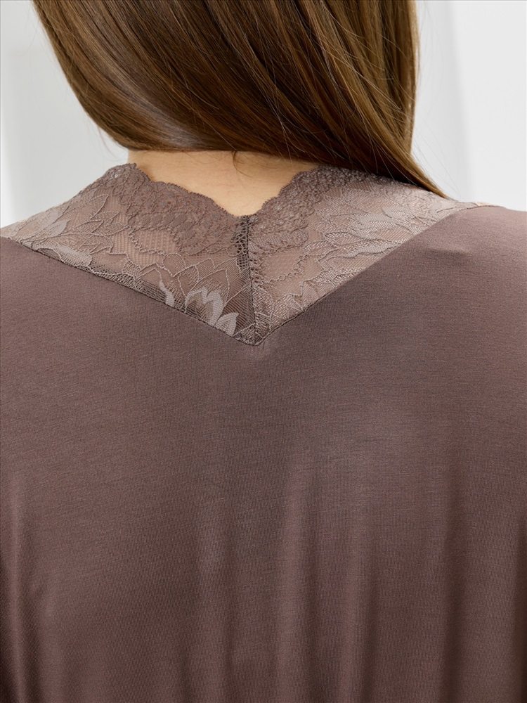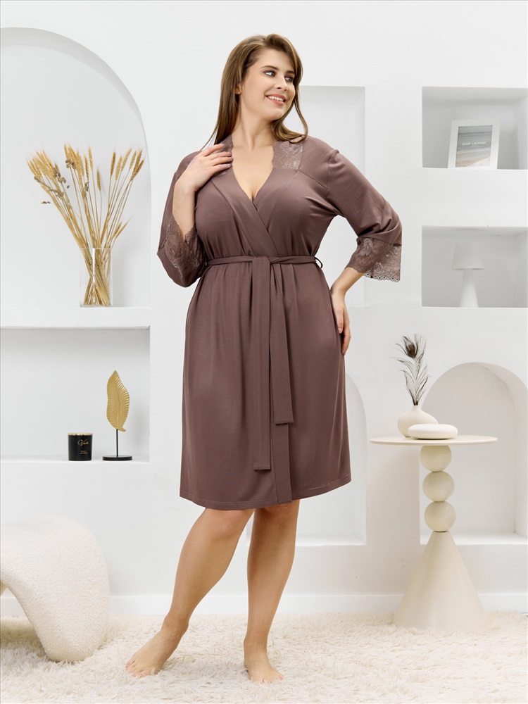 Ткань: Вискоза ВИСКОЗА - это достаточно интересный материал, получаемый из натурального сырья (целлюлозы) искусственным путем. Интересна ткань тем, что она может быть похожа на шелк, шерсть или лен. Все зависит от того, каким способом материал был обработан. Ткань очень приятная и мягкая на ощупь, образовывает на изделиях красивые складки. Из-за своей достаточно высокой гигроскопичности, вискоза способна впитать много влаги, так, например, по сравнению с хлопком, она впитывает ее в два раза больше. Явным преимуществом вискозы является то, что она не электризуется. Халат из гладкокрашеного трикотажного вискозного полотна, на запахе, с втачными рукавами 3/4 длины, кружевными манжетами, притачной планкой по бортовым срезам и съемным поясом, продетым через две шлевки в боковых швах. Спинка с кружевной притачной кокеткой - V-образной формы, бортовая планка с кружевными вставками, переходящими на полочку.