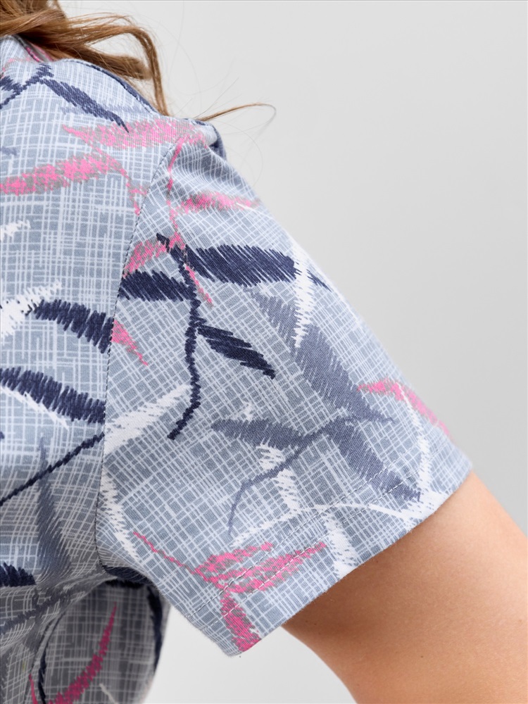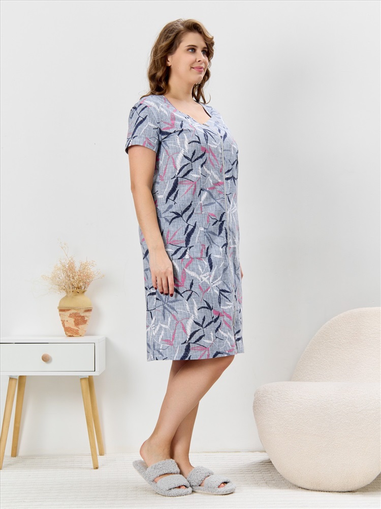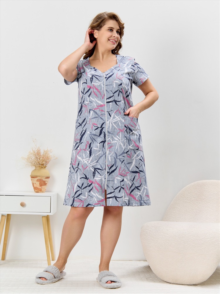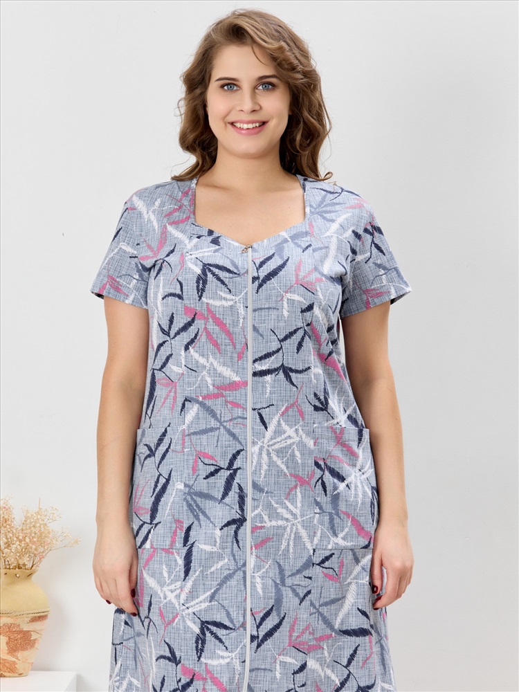 Ткань: Кулирка Кулирка - это самое гладкое и тонкое трикотажное полотно из чистого хлопка. С лицевой стороны ткань «кулирка» выглядит как «вертикальные косички», орнамент изнаночной стороны напоминает «кирпичную кладку». Свойства кулирного трикотажа- воздухопроницаемость, гигроскопичность, не теряя своей формы, практически не тянется в длину и хорошо растягивается в ширину, не образует складки. Халат женский из трикотажного полотна «кулирка» с набивным рисунком, прямого силуэта, с короткими втачными рукавами, горловиной фигурной формы, двумя накладными карманами на уровне бедер и центральной бортовой застежкой на тесьму «молния». Полочка – с рельефными швами, выходящими из горловины. Нижние срезы горловины обработаны притачными планками. Остальная часть горловины окантована основным материалом.