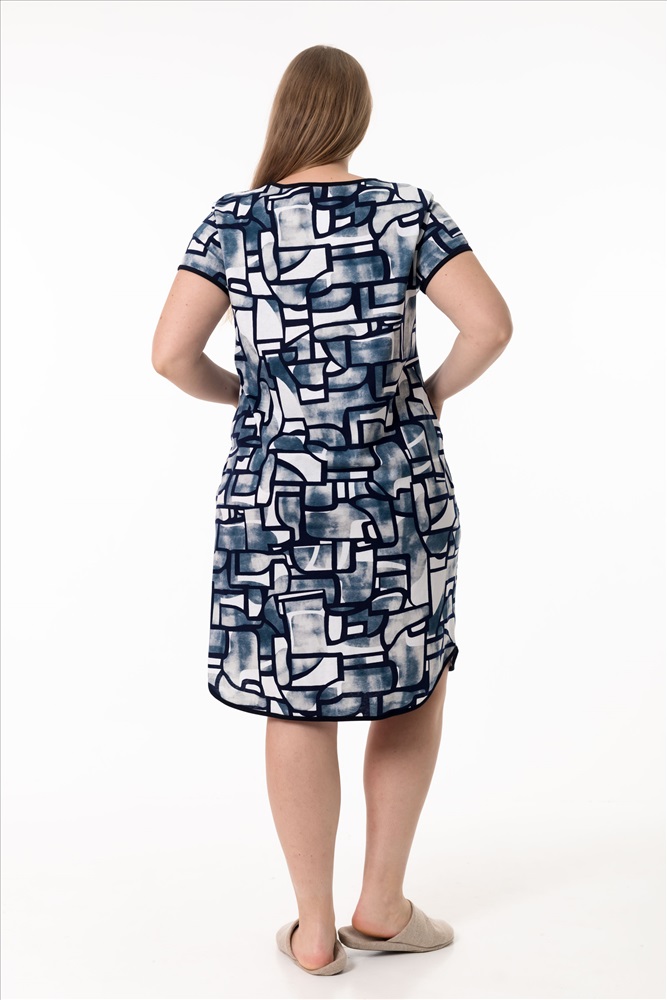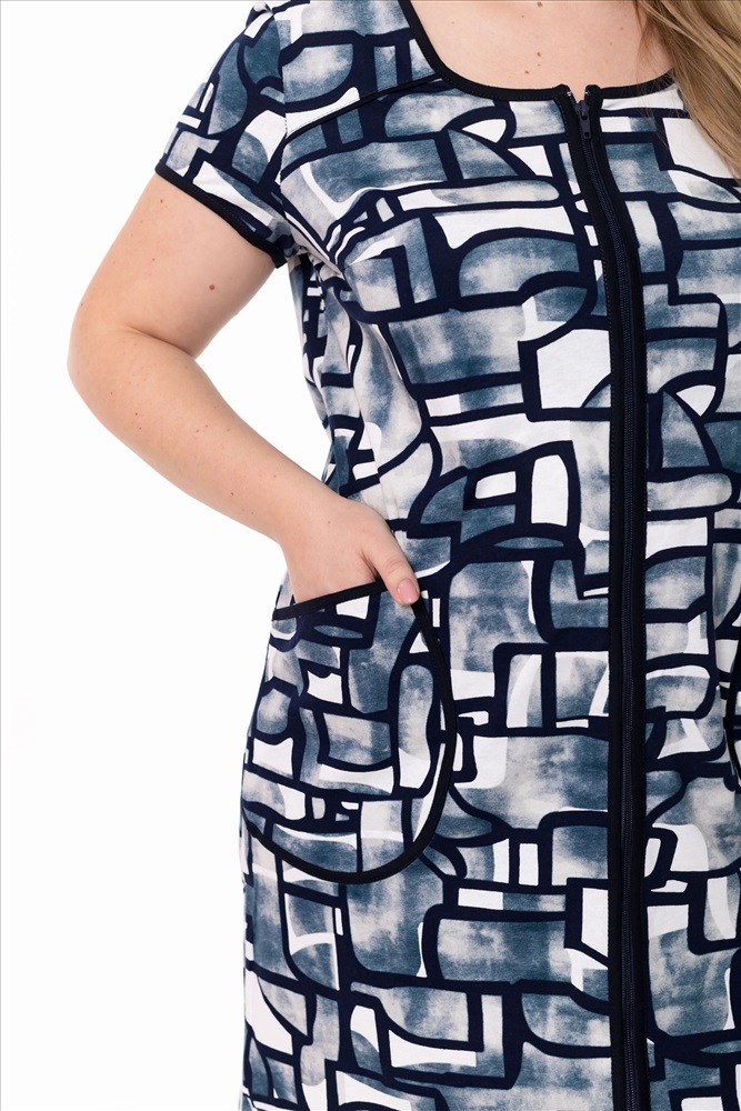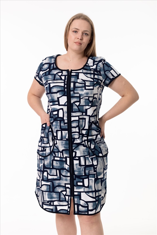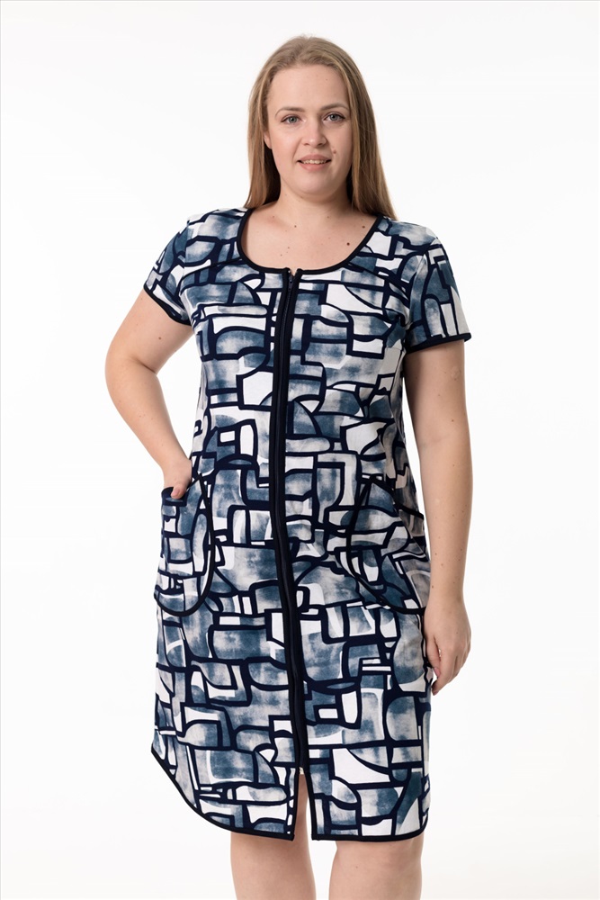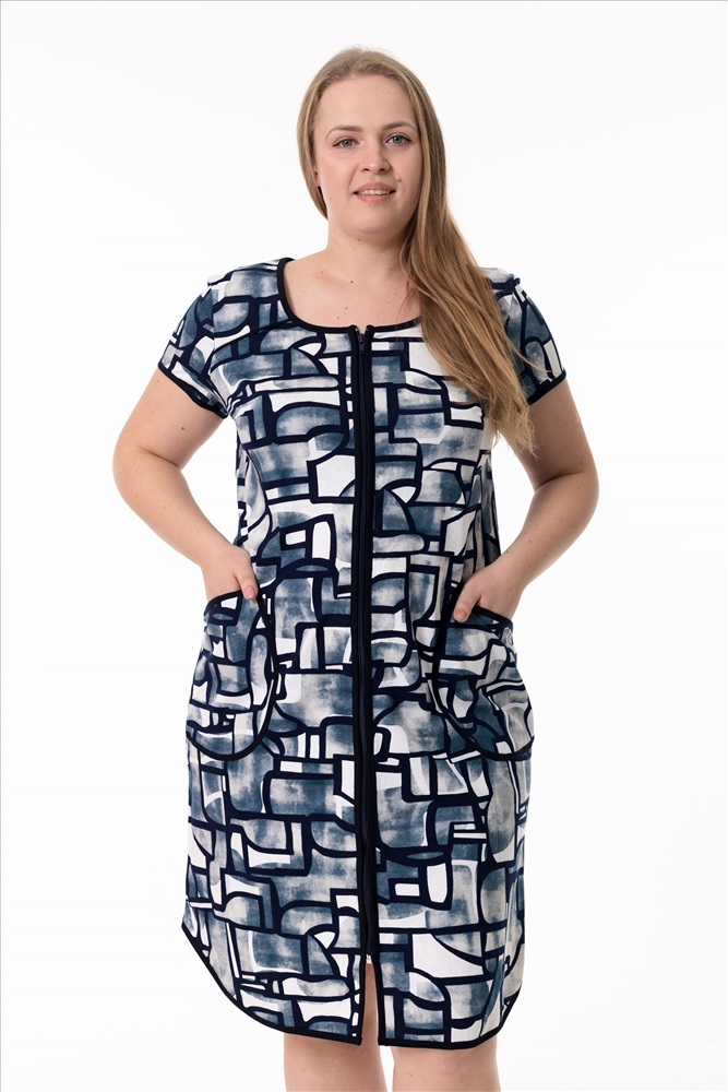 Тип длинны (для платьев): До колена Вид ткани: Кулирка Застежка: Молния С карманами: Да Сезон: Всесезонный Состав: Хлопок 100% Цвет Номенклатуры: синий/изумруд Халат с коротким рукавом выполнен из кулирки с набивным рисунком. Центральная застёжка на молнию. Спереди расположены накладные карманы. Горловина, рукава, низ и борта халата обработаны отделочной бейкой. Комментарии к товару