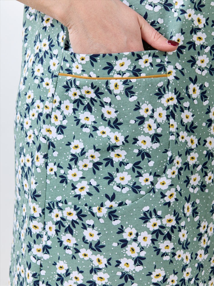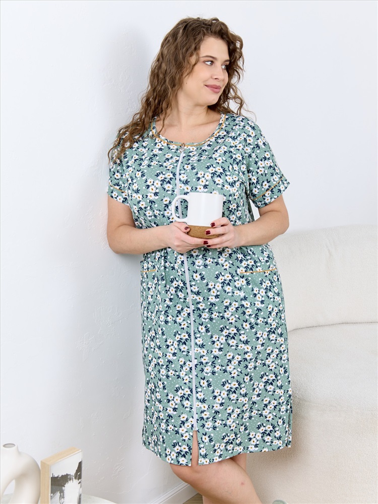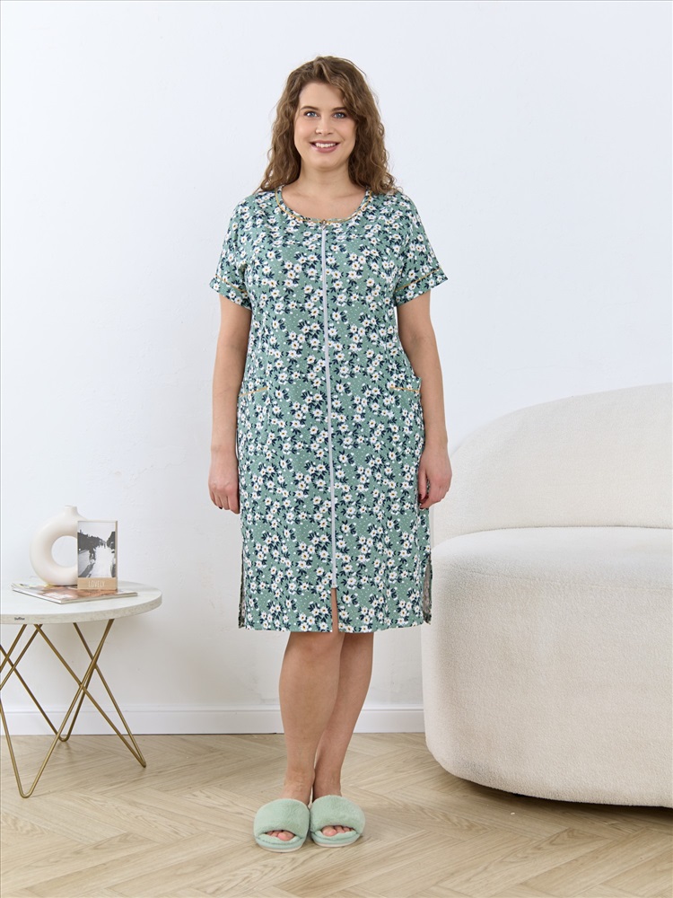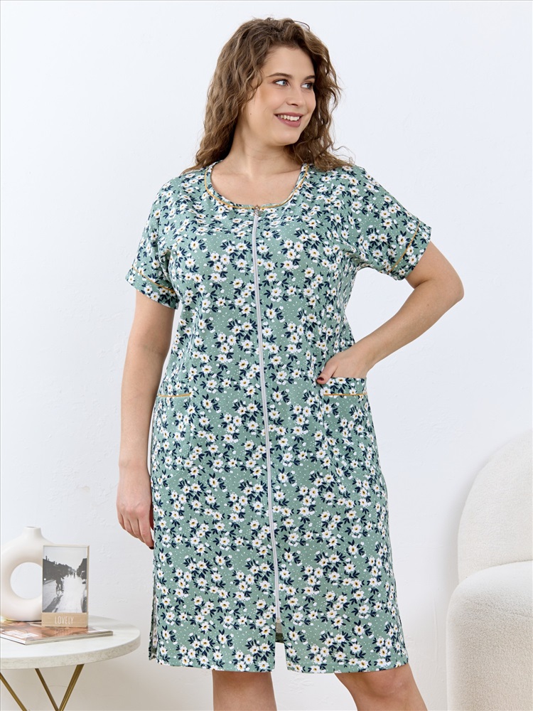 Ткань: Кулирка Кулирка - это самое гладкое и тонкое трикотажное полотно из чистого хлопка. С лицевой стороны ткань «кулирка» выглядит как «вертикальные косички», орнамент изнаночной стороны напоминает «кирпичную кладку». Свойства кулирного трикотажа- воздухопроницаемость, гигроскопичность, не теряя своей формы, практически не тянется в длину и хорошо растягивается в ширину, не образует складки. Халат - женский трикотажного полотна «кулирка» с набивным рисунком, свободного покроя, расширенный к низу, с короткими цельнокроеными рукавами, горловиной овальной формы, окантованной двойным кантом и разрезами в боковых швах, центральной бортовой застежкой на тесьму « молния». Рукава с притачными манжетами и кантом, полочки с отрезными бочками в нижней части и боковыми карманами на уровне бедер. Верхние срезы карманов обработаны притачными планками с кантом.