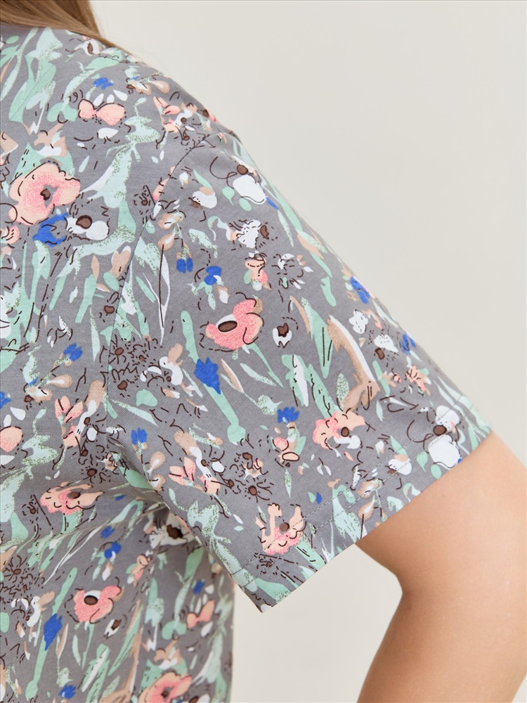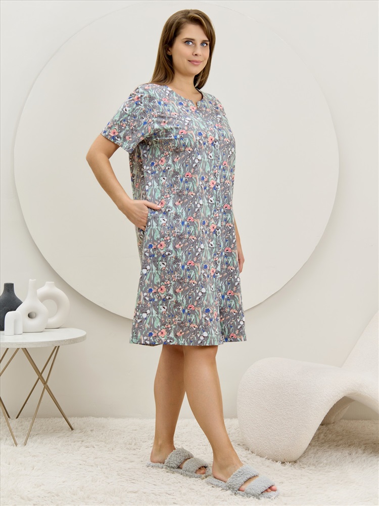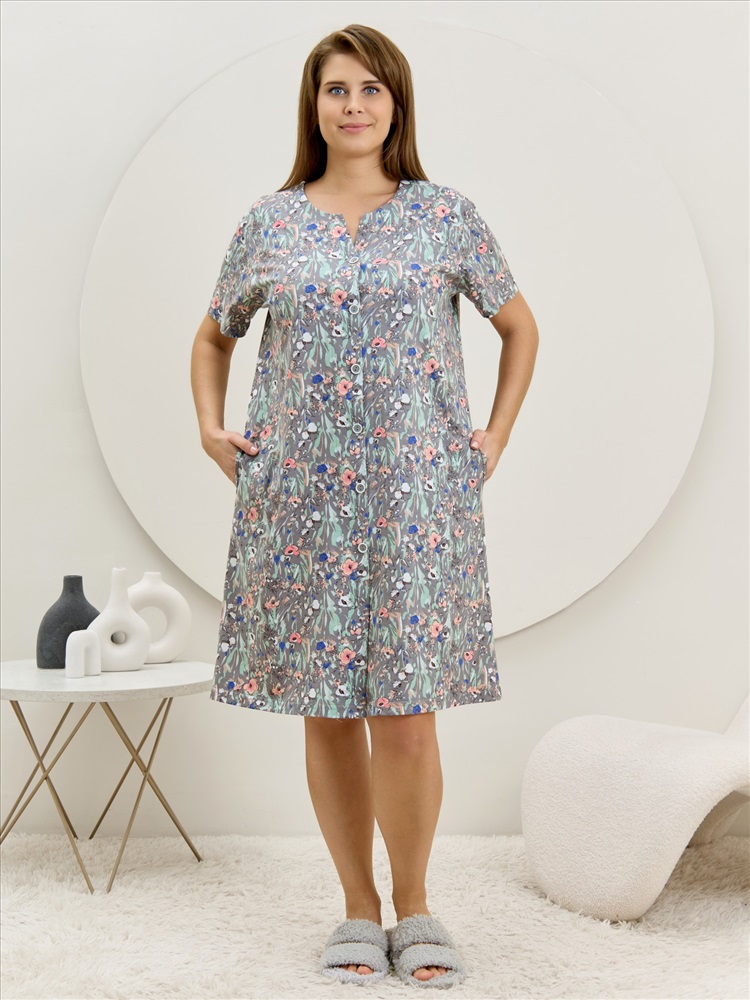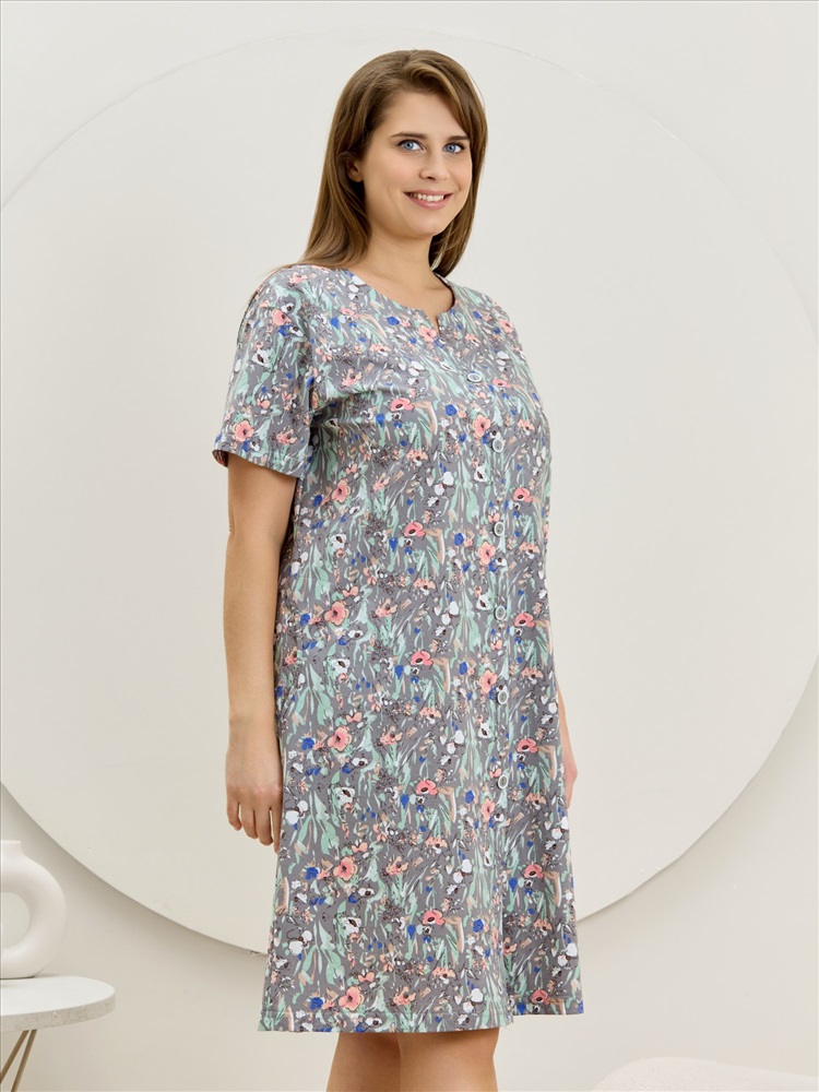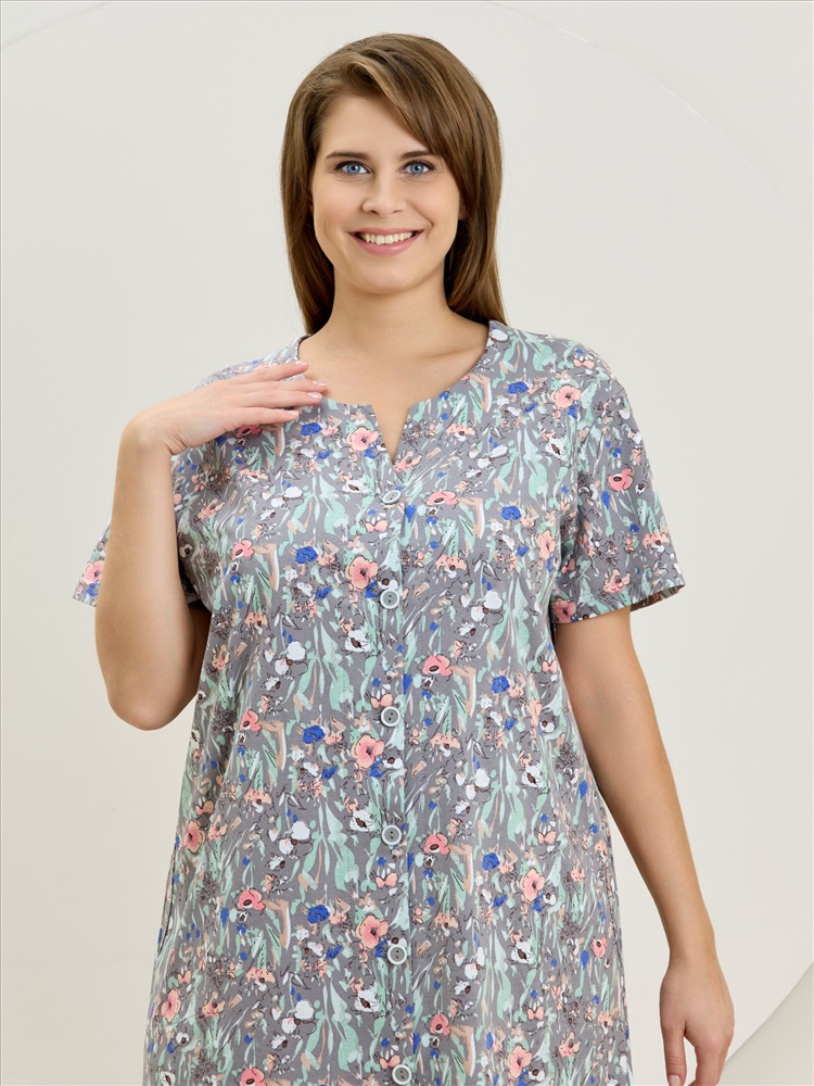Халат женский из трикотажного полотна «кулирка» с набивным рисунком, прямого силуэта, с короткими втачными рукавами, карманами в боковых швах и центральной бортовой застежкой на обметанные петли и пуговицы. Горловина – овальной формы, переходящая в небольшой v-образный вырез выше верхней пуговицы. Входы в карманы и горловина спинки окантованы.