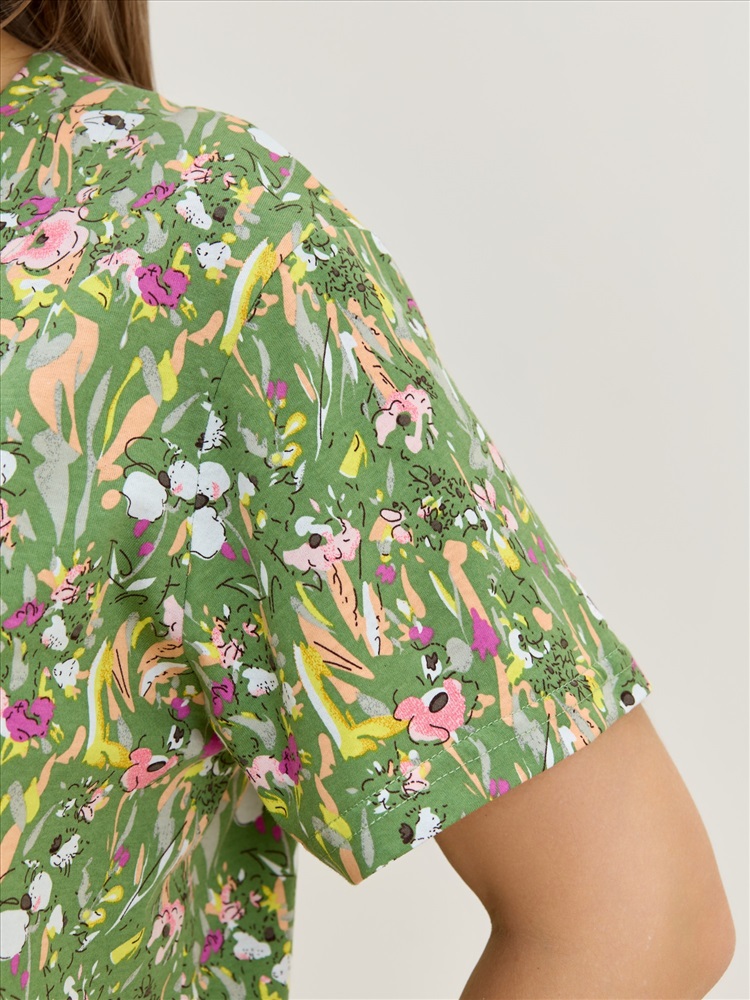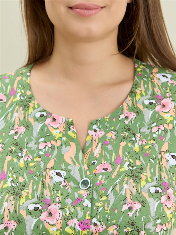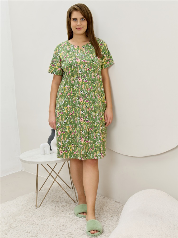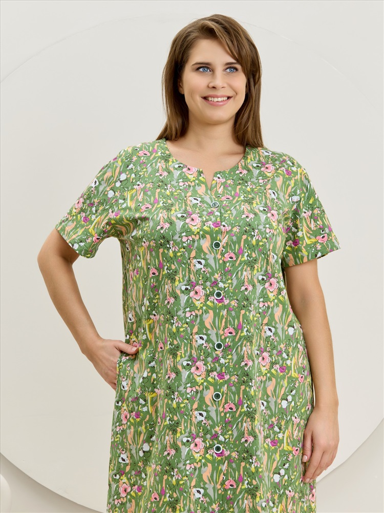 Ткань: Кулирка Кулирка - это самое гладкое и тонкое трикотажное полотно из чистого хлопка. С лицевой стороны ткань «кулирка» выглядит как «вертикальные косички», орнамент изнаночной стороны напоминает «кирпичную кладку». Свойства кулирного трикотажа- воздухопроницаемость, гигроскопичность, не теряя своей формы, практически не тянется в длину и хорошо растягивается в ширину, не образует складки. Халат женский из трикотажного полотна «кулирка» с набивным рисунком, прямого силуэта, с короткими втачными рукавами, карманами в боковых швах и центральной бортовой застежкой на обметанные петли и пуговицы. Горловина – овальной формы, переходящая в небольшой v-образный вырез выше верхней пуговицы. Входы в карманы и горловина спинки окантованы.
