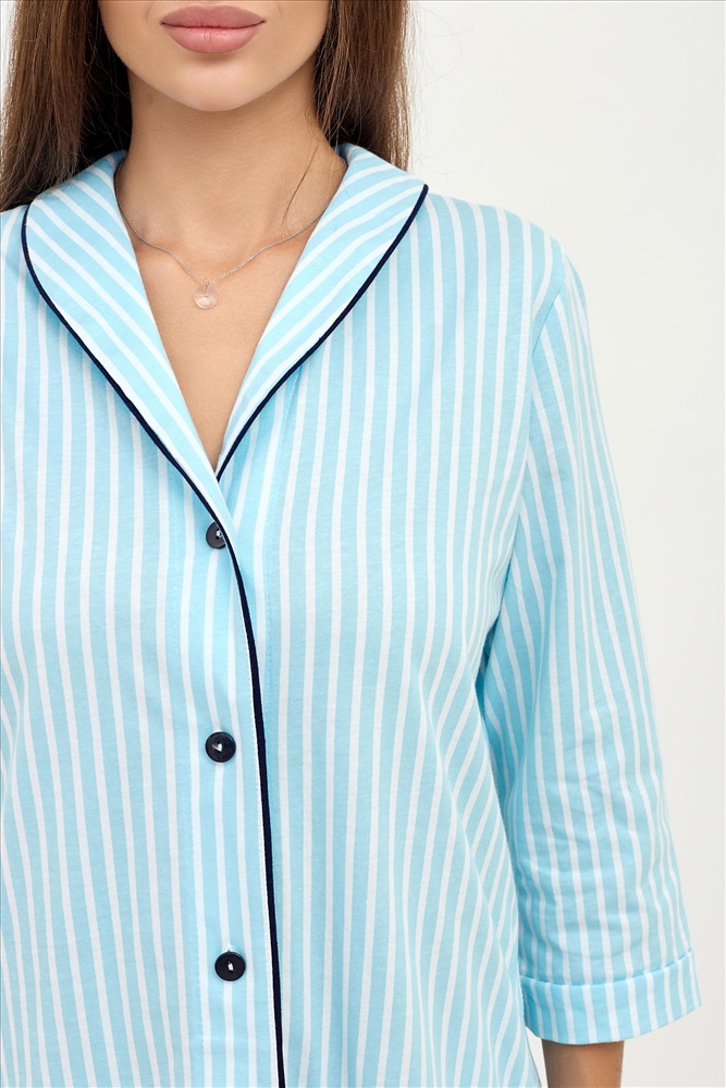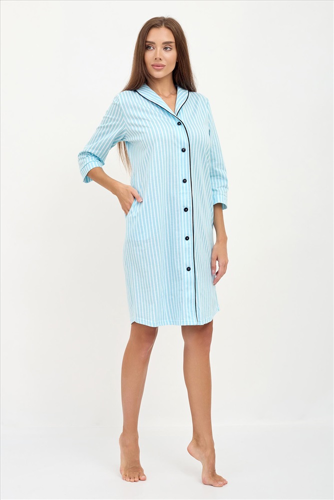 Состав: Хлопок 100% ГОСТ: 31409-2009 Цвет: Голубой Изготовитель: ИП Вартанян Марина Валерьевна Торговая марка: Lika Dress Тип ткани: Кулирка Для кого: для женщин Застежка: Пуговицы Плотность ткани: Тонкая Уход: Деликатная стирка, Ручная стирка. Карманы: В боковом шве ТН ВЭД: 6108910000 Нежный и романтичный халат для дома и отдыха. Визуально удлинит силуэт из-за рисунка вертикальной полоски. Отложной воротник, застежка на пуговицы, рукав три четверти – все делает модель удобной и красивой. Комментарии к товару