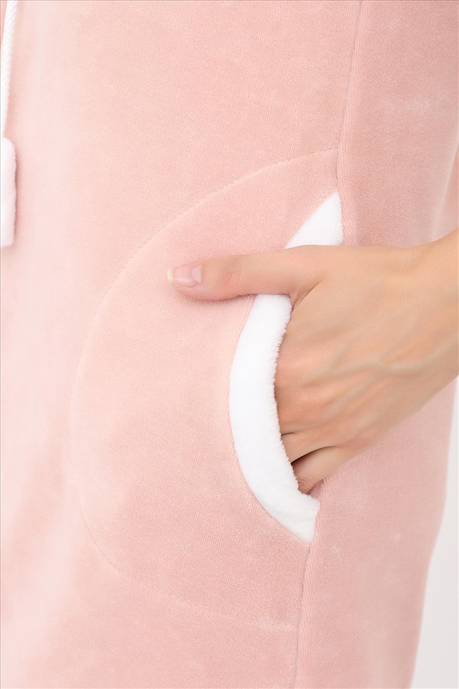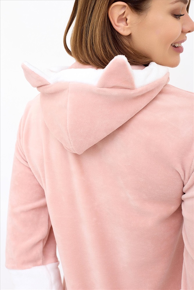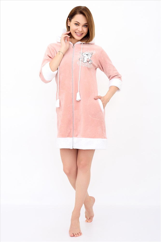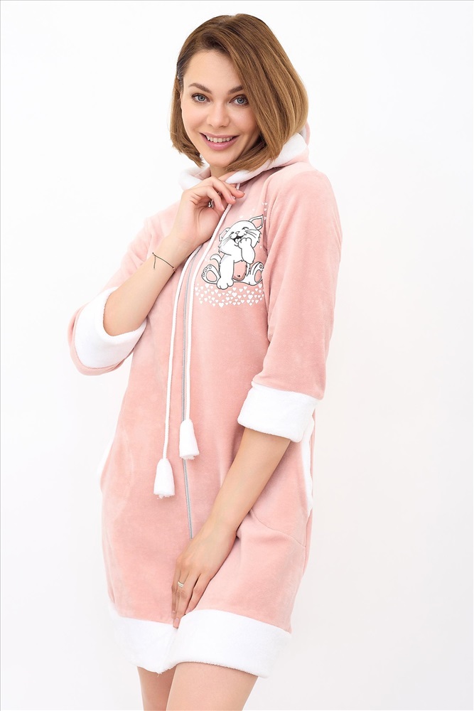 Женский домашний халат с милым котиком на груди. Модель прямого кроя с застёжкой на молнию. Халат с капюшоном, который украшают забавные кошачьи ушки. В капюшон вставлен шнурок с помпонами на концах. Халатик выполнен из велюрового полотна с меховой отделкой на манжетах рукавов, капюшоне, карманах и по низу изделия.