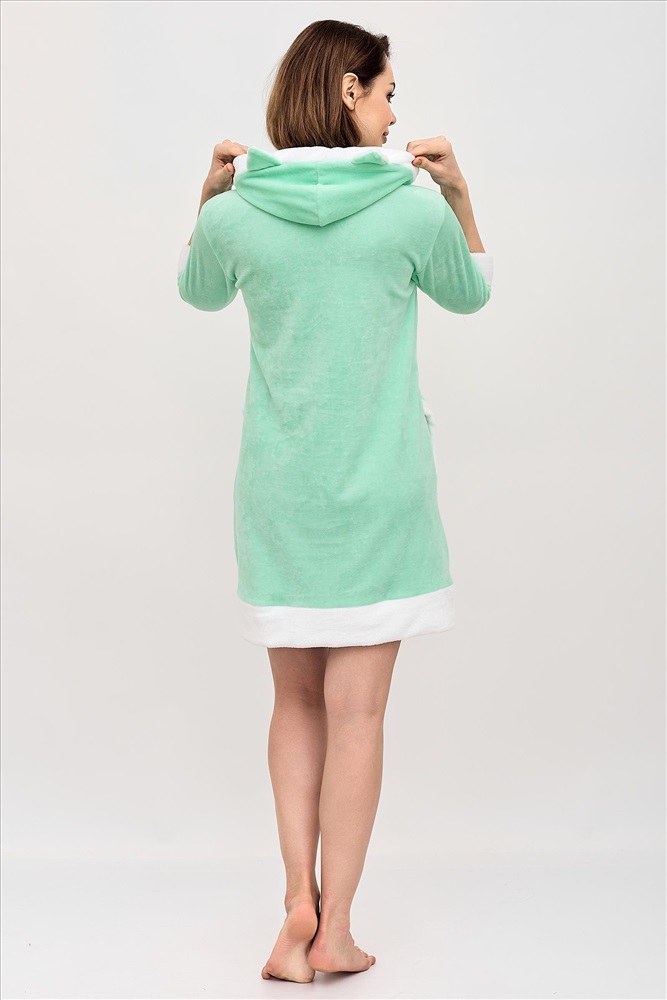 Состав: Хлопок 80%, П/Э 20% ГОСТ: 31409-2009 Цвет: Ментол Изготовитель: ИП Вартанян Марина Валерьевна Торговая марка: Lika Dress Тип ткани: Велюр Длина изделия: По спинке- 40/42-83,44/46-84,48/50-86,52/54-90 Для кого: для женщин Застежка: Молния Плотность ткани: Плотная Уход: Машинная стирка Карманы: В боковом шве Вид изделия: Халаты Сезонность: Осень - Зима ТН ВЭД: 6108990000 Женский домашний халат с милым котиком на груди. Модель прямого кроя с застёжкой на молнию. Халат с капюшоном, который украшают забавные кошачьи ушки. В капюшон вставлен шнурок с помпонами на концах. Халатик выполнен из велюрового полотна с меховой отделкой на манжетах рукавов, капюшоне, карманах и по низу изделия. Комментарии к товару