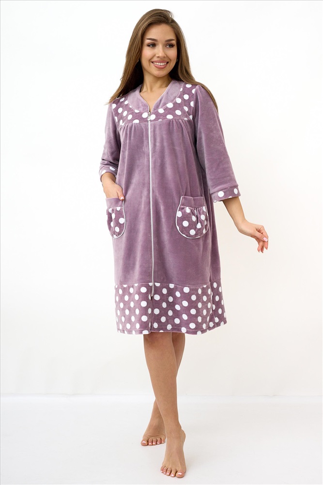 Красивый велюровый халат для дома. Застежка на молнии, свободный крой, два больших накладных кармашка для мелочей, воротник стоечка, длина до колена – все детали идеально сочетаются в модели. Удобный, повседневный женский халат для домашних дел.