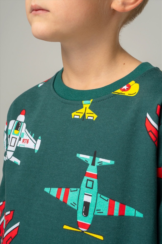 Теплая детская пижама с брюками для мальчиков выполнена из 100% хлопка. Пижама из футера с начесом станет любимым атрибутом отдыха благодаря свободному крою и симпатичному дизайну. Пижамка украшена принтом самолеты. Домашняя пижама выполнена из трикотажной ткани футер, которая идеальна для зимы. Начес отлично сохраняет тепло. Пижама для детей не боится частых стирок и надолго сохраняет первоначальный внешний вид. В наборе утепленные штаны и джемпер с длинным рукавом. Благодаря эластичным манжетам рукава и штанины не задираются, а хлопковая пижамка комфортна во время сна. Мягкая резинка в поясе нежно прилегает по талии, прямой крой дарит свободу движений. Зеленая пижама из трикотажа идеальна для дома, детского сада, отдыха и активных игр. Модель Женя, его рост 126 см, параметры 59-64-58 см. На нем размер 128.