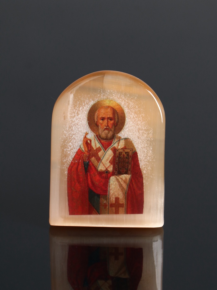 Образ, выполненный в тёплых тонах селенита, несёт в себе ощущение тишины и умиротворения. Такую икону можно взять с собой в путешествие или поставить на рабочем столе — она будет мягко направлять ваши мысли к вере, не требуя много места. Природная текстура камня делает каждый образ уникальным.