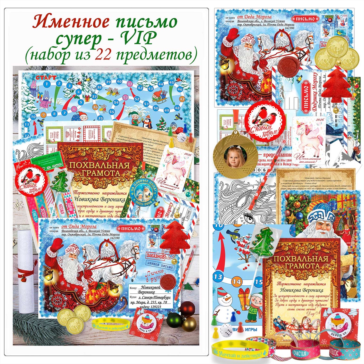Это письмо от Деда Мороза не просто именное, но и персонализированное! Подарите волшебство! ❤️ В состав именного письма VIP входят 22 предмета: ✔ Огромный именной конверт с адресом получателя. ✔ Сургучная печать Деда Мороза на конверте ✔ Именное персонализированное письмо с увлекательной новогодней историей ✔ Именная похвальная грамота от Деда Мороза ✔ Золотая медаль от Дедушки Мороза «За добрые дела» с фото ребёнка! ✔ Светонакопительный браслет «Мечтай и действуй! Ты всё сможешь!» ✔ Огромная новогодняя игра ходилка + фишки и кубик ✔ Мягкая игрушка-подвеска на елку или для украшения интерьера ✔ Игра новогодние новогодние фанты для веселой новогодней ночи ✔ Игра с предсказаниями на новый год + раскраска с символом наступающего года ✔ Прекрасный магнит с новогодним персонажем ✔ Новогодний леденец на палочке ✔ Три вкусных шоколадных монеты от Деда Мороза ✔ Замечательный новогодний значок с теплым пожеланием ✔ Чудесная новогодняя ручка со стираемыми чернилами ✔ Набор для изготовления трех разных новогодних снежинок ✔ Чудесный новогодний календарик на 2026 г. ✔ Набор для создания новогодней гирлянды длиной 2,5 метра (50 полосок заготовок с теплыми пожеланиями) ✔ Набор для создания письма Деду Морозу (конверт + бланк письма) * Конверт от Деда Мороза — формат C4 = 229×334 мм. (огромный — больше, чем альбомный лист). * Конверт с бланком письма для отправки Деду Морозу — формат C5 = 162×229 мм. * Металлическая медаль под золото с фото получателя и изображением Деда Мороза и Снегурочки с обратной стороны — диаметр 50 мм. * Письмо, грамота, раскраска + игра с предсказаниями, снежинки, фанты — формат А4 = 210×297 мм. * Игра ходилка — формат А2 = 594×420 мм (как четыре альбомных листа) * Авторский дизайн конвертов, писем и грамот, созданный профессиональным художником. * Индивидуальные тексты, созданные профессиональными писателем, с учетом возраста получателя письма и ваших пожеланий. * Мы используем несколько разных видов дизайна подарков при комплектации конвертов, чтобы максимально разнообразить их. А так же учитываем, кому предназначено письмо — мальчику или девочке. Комментарии к товару