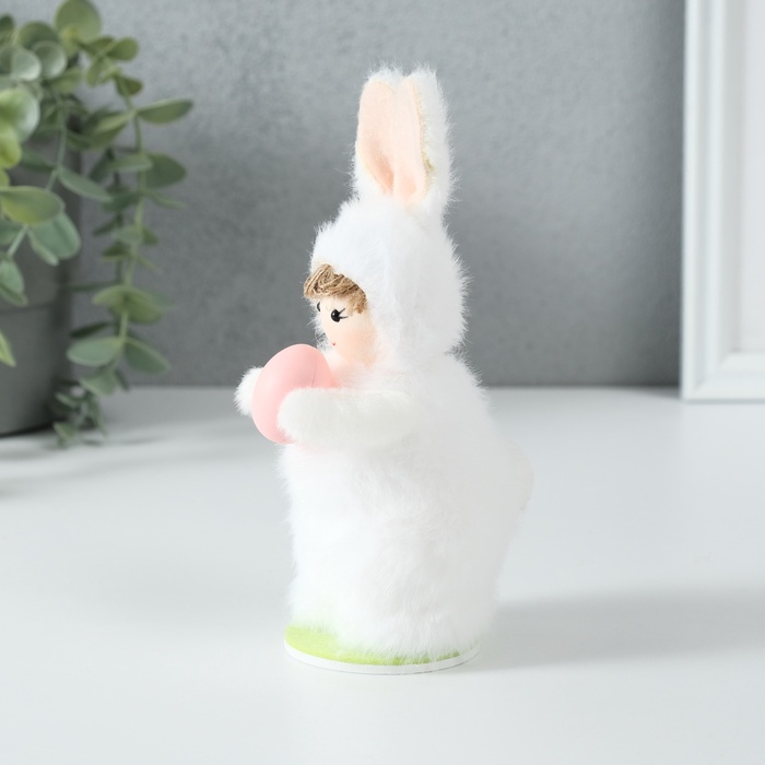 Малыш в костюме зайчика, бережно держащий яйцо, выполнен с особым вниманием к деталям. Мягкие текстильные материалы приятны на ощупь, а устойчивая подставка позволяет разместить фигурку даже на узкой поверхности. Внутренний каркас из пенопласта сохраняет форму, делая куклу долговечным украшением.