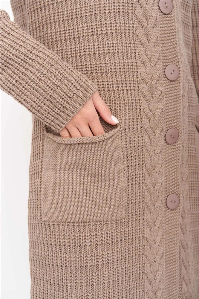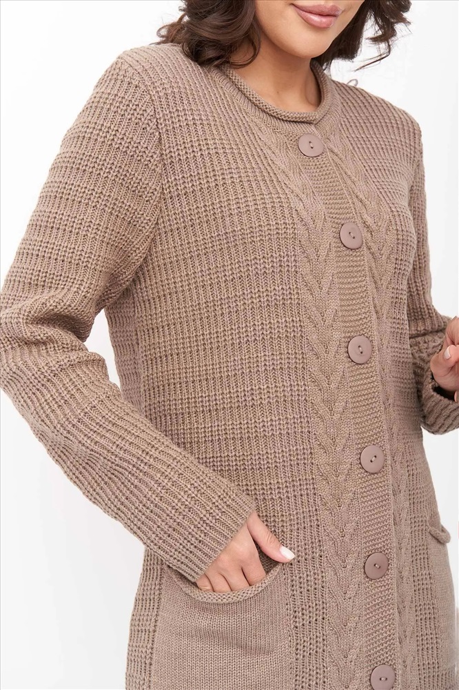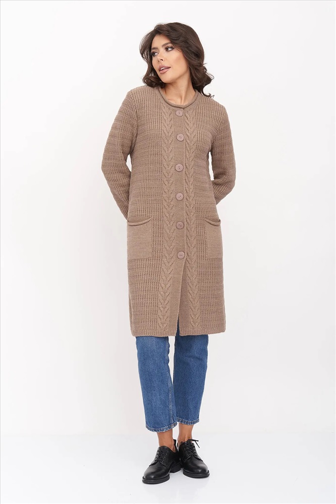 Стильный вязаный женский кардиган прямого силуэта на пуговицах с круглой горловиной. Рукав втачной полной длины. Накладные карманы. Оригинальный узор с ажуром и косами. Кардиган с добавлением шерсти согреет в прохладную погоду и придаст оригинальности любому повседневному образу.