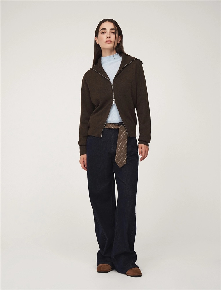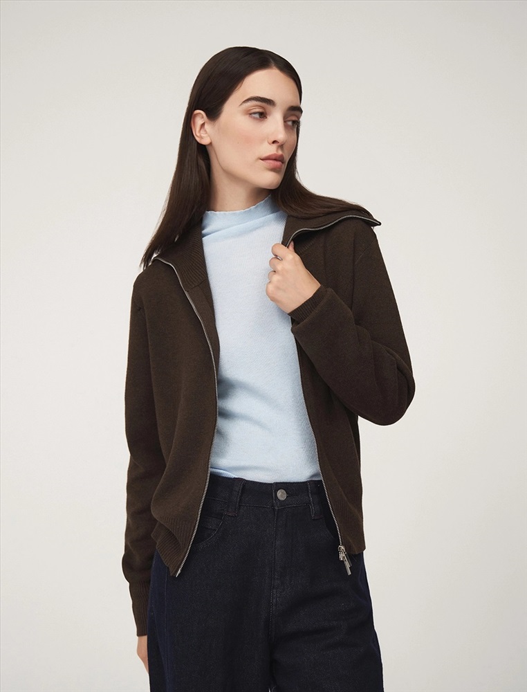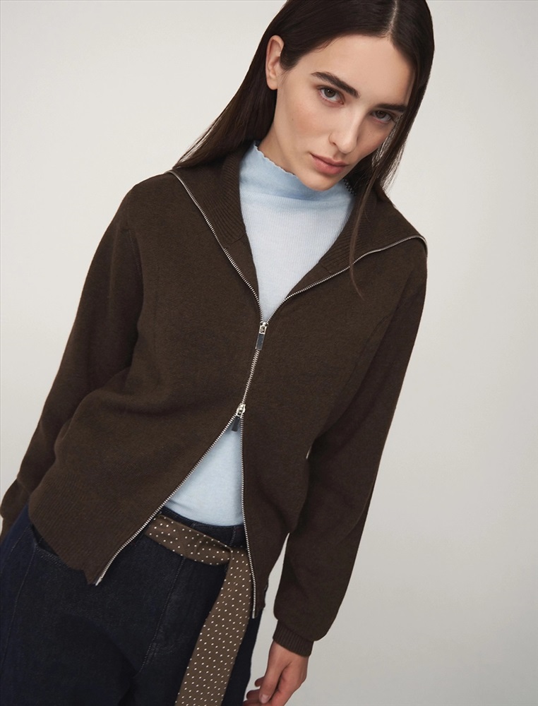 Джемпер прямого силуэта на реверсивной молнии. Акцентом изделия является высокий воротник с функцией отворота и рельефы по переду и спинке. Горловина, низ изделия и рукавов оформлены по типу английской резинки.