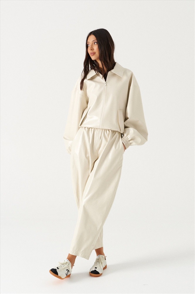 Куртка-бомбер свободного кроя. Выполнена из эко-кожи молочного (светло-бежевого) цвета. С подкладкой. Воротник отложной, горловина круглая. Рукав втачной, спущенный, с манжетом на резинке. Застёжка центральная - молния. Низ изделия на резинке. По переду внизу карманы с клапаном. Длина рукава от линии втачивания 59 см. Длина спинки 55 см.