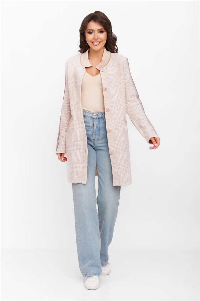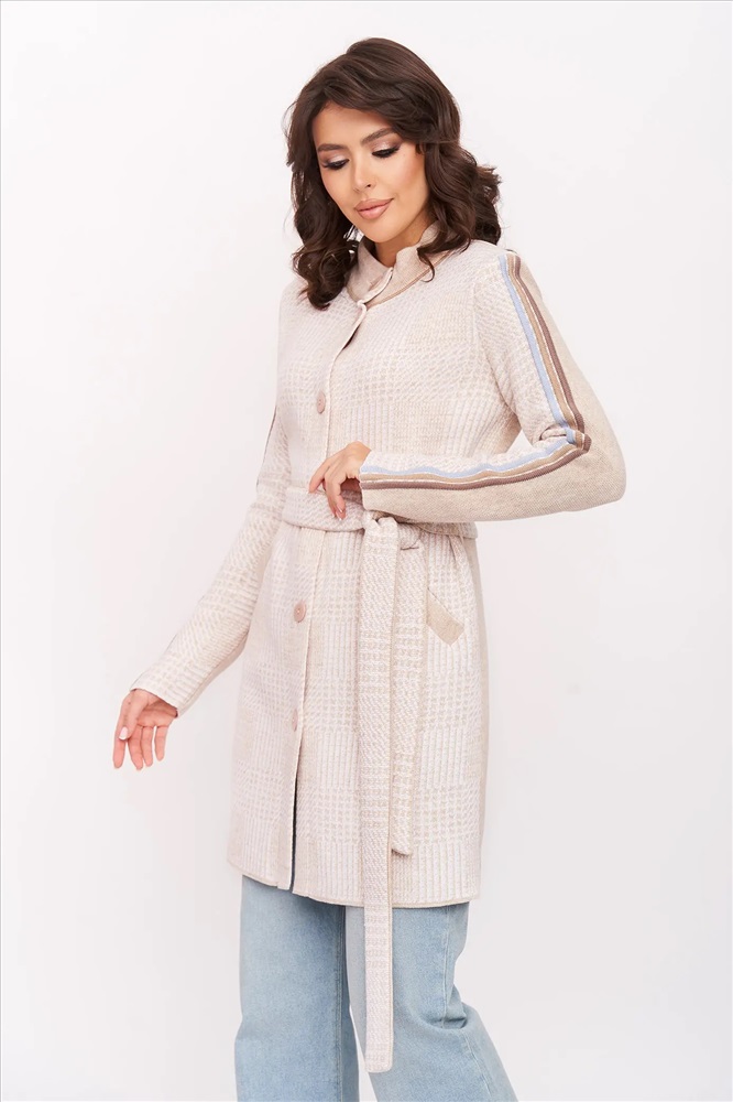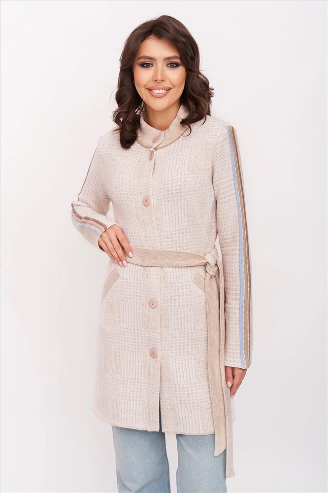 Состав: 30% хлопок/70% ПАН Длина изделия: 84 см Длина рукава: длинный рукав 61 см Комплектация: пояс Новизна: Распродажа Сезон: демисезон Бренд: Текстильная Мануфактура ТН ВЭД: 6110309900 Женский трикотажный кардиган прямого силуэта с поясом. Рукава втачные длинные, воротник-стойка. Застежка на пуговицы. Два прорезных кармана с листочкой. Кардиган выполнен жаккардовым переплетением, образующим клетку. Однотонная спинка.Отделка декоративной бейкой. Комментарии к товару