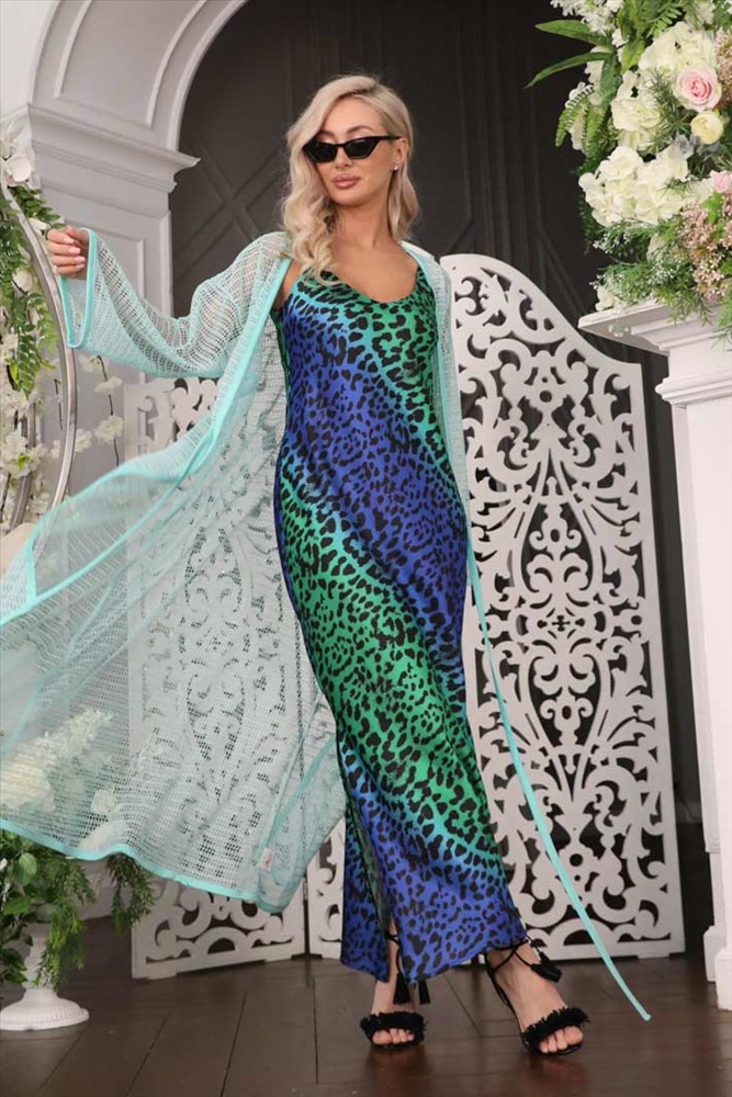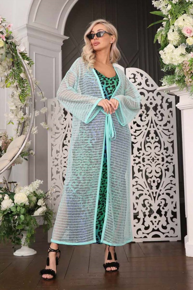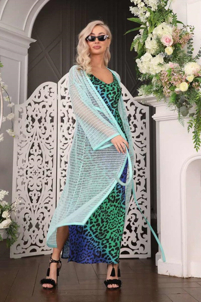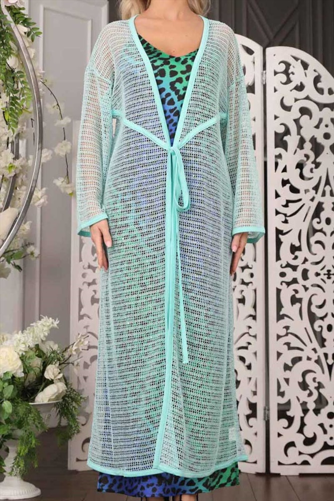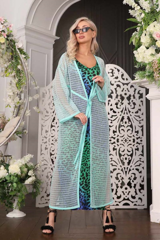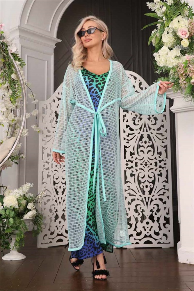 Эффектный кардиган свободного силуэта из трикотажного полотна бирюзового цвета с легким блеском. Линия груди подчеркнута кантом. Кардиган с втачными рукавами и контрастными окантовками. Аксессуары в комплект не входят.