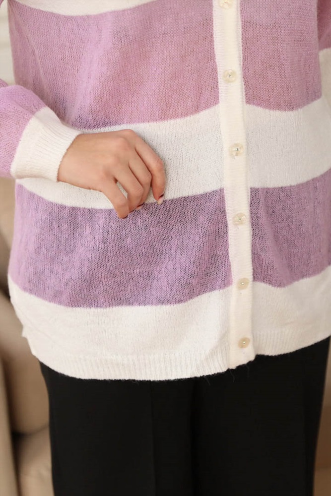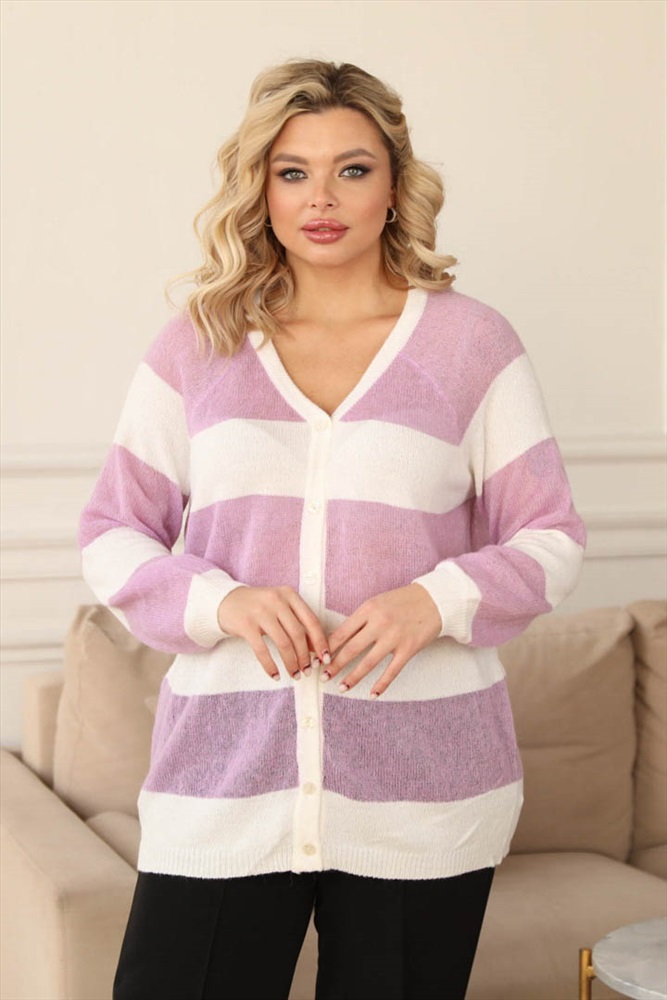 ШтрихКод: 4650333179278 По размеру: 50, 52, 54, 56 Состав: Мохер 60% Акрил 40% Срок готовности: 2016-01-19T00-00-00 Очаровательный кардиган свободного силуэта бело-сиреневого цвета. Джемпер выполнен в технике «ручного вязания» из натуральных нитей с содержанием мохера. Фигурный вырез изделия обработан двусторонней лицевой бейкой. По низу втачных рукавов и низу изделия - манжеты. По переду изделия планка с застежкой на пуговицы. Аксессуары в комплект не входят. Длина изделия по спинке от плечевого шва до низа изделия — 76 см. Комментарии к товару