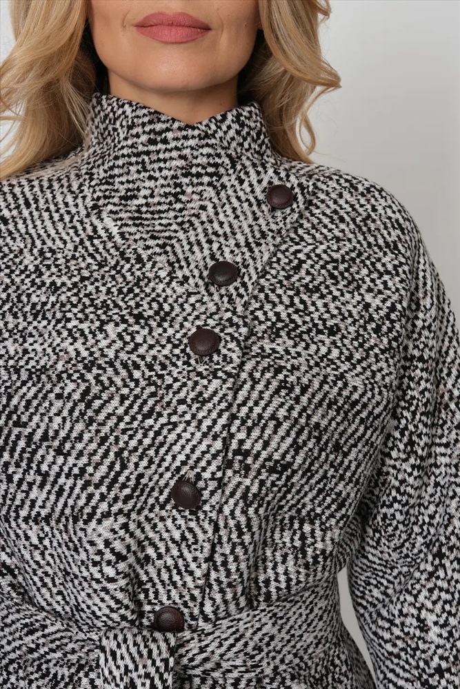 Кардиган женский трикотажный полуприлегающего силуэта длиной до середины бедра. Кардиган застегивается на пуговицы по переду и воротнику-стойке. Рукав цельнокроенный длинный. Накладные симметричные карманы. Изделие выполнено жаккардовым переплетением образующим мелкий геометрический рисунок.