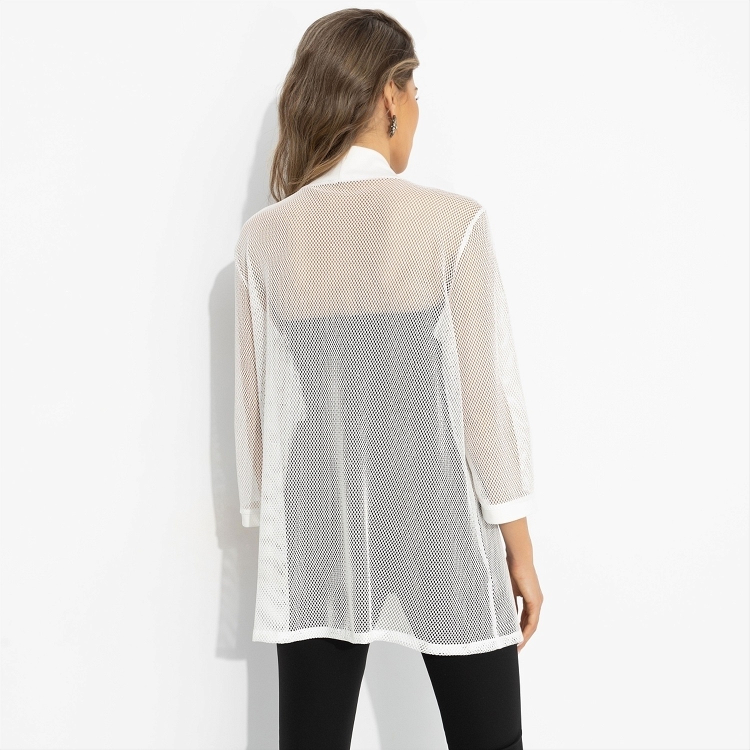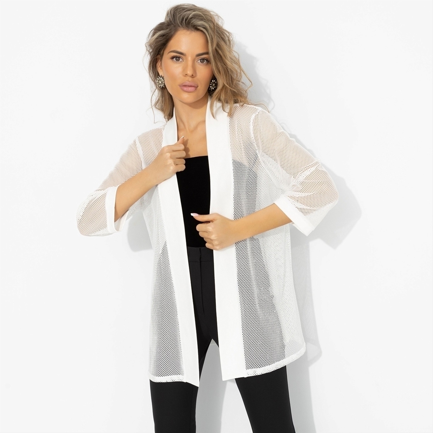 Заметили, как часто в кадрах о бизнесе и важных решениях героиня накидывает что-то на плечи в самый ответственный момент? Белый кардиган – это тот самый приём. Его легко представить на плечах амбициозной Шивон Рой из «Наследников». Лёгкая сетка-стрейч создаёт ощущение прозрачности и многослойности. Кардиган удобно носить поверх платьев, топов и блуз – как финальный штрих. Белый цвет добавляет свежести и визуального света. Подходит для офиса, мероприятий и образов, где важна элегантная недосказанность. Изделие без пояса.