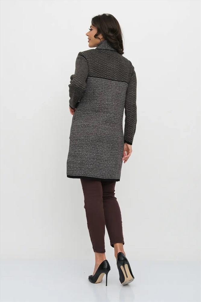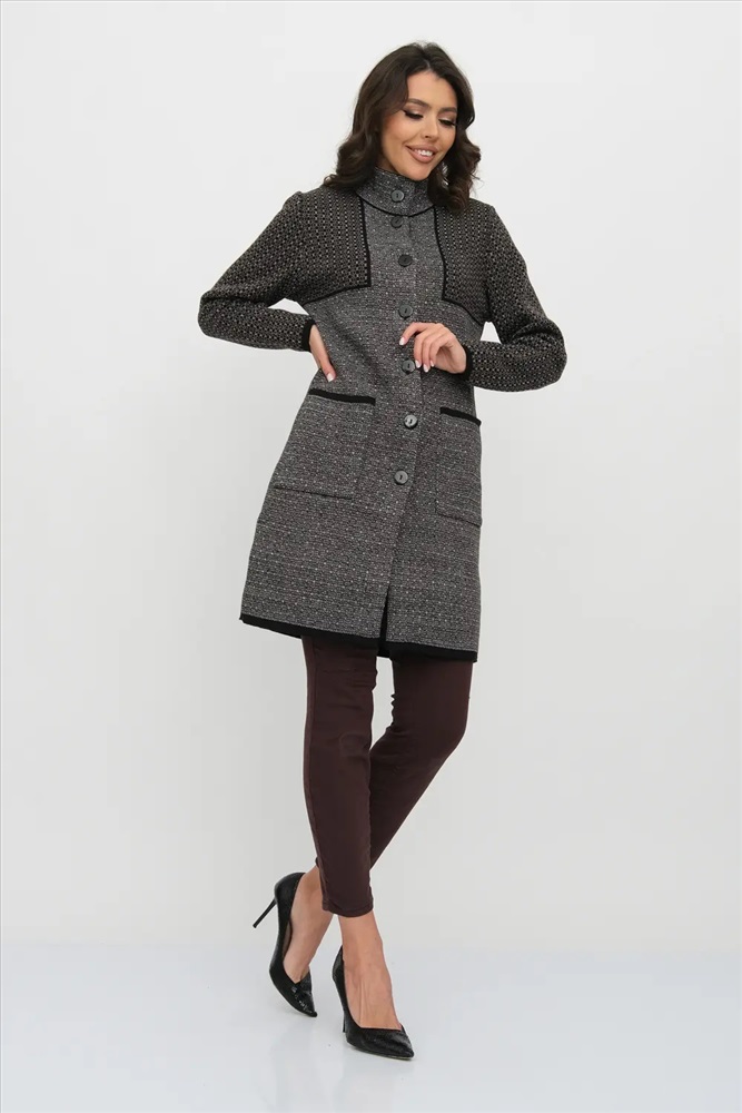 Женский вязаный кардиган полуприлегающего силуэта с воротником-стойкой. Кардиган застегивается на пуговицы. Рукава втачные длинные. Накладные карманы прямоугольной формы. Кардиган выполнен жаккардовым переплетением.