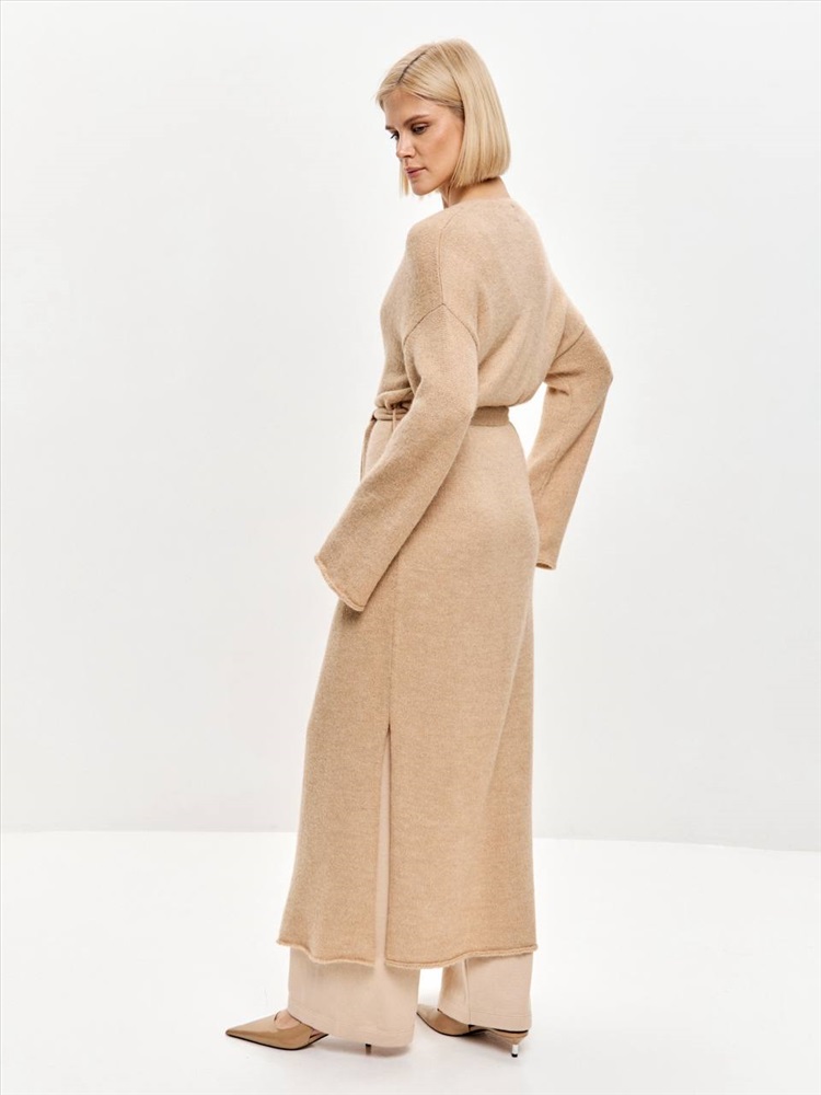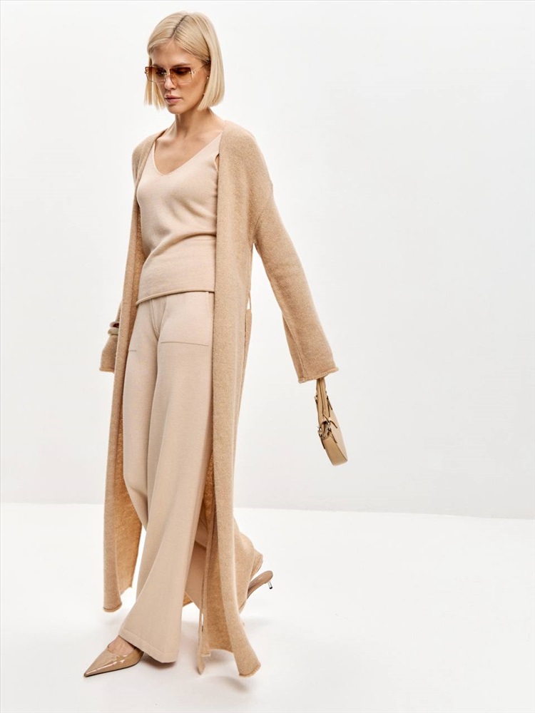 Дизайн кардигана отличается современными нотами: рукава слегка расширены к низу, что придаёт модели изящность и женственность. Широкий пояс, закрепленный на вывязанных боковых шлевках, позволяет экспериментировать с образом — носить кардиган свободно или завязывать его для элегантного акцента на талии. Мы индивидуально подберём длину кардигана под ваш рост, чтобы обеспечить идеальную посадку. Также наши консультанты помогут выбрать юбку или джемпер из той же мягкой пряжи и в аналогичном цвете, чтобы создать идеальные элегантные комплекты. Кардиган SICILY — это не просто одежда, это стильный универсальный элемент вашего гардероба, который будет актуален во многих сочетаниях! Обмеры: Ширина изделия по груди: 61-63 см. Ширина изделия по бедрам: 59-61 см Длина рукава от воротника: 69-71 см. Длину подбираем индивидуально. Обмеры сделаны не в натянутом положении, трикотажные изделия могут иметь погрешность 1-2 см. Ручная стирка: при температуре не более 30 градусов. Замачивать 5 минут, не тереть, прополоскать до исчезновения пены. Машинная стирка: при температуре 30 градусов. Не использовать средства, содержащие отбеливатель. Без отжима. Для удаления лишней влаги аккуратно сжать руками. Сушить: разложив на плоскую поверхность, подальше от батареи и прямых солнечных лучей. Не вешать. Гладить: через тонкую смоченную тряпку в режиме отпаривания. Комментарии к товару