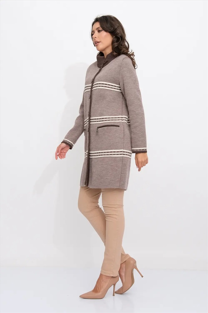 ТН ВЭД: 6110309900 Женский  вязанный кардиган прямого силуэта. Воротник-стойка. Застегивается на пуговицы Рукава втачные длинные. Два прорезных кармана с молнией. Кардиган выполнен жаккардовым переплетением с горизонтальными контрастными полосами.  Он согреет вас в прохладный день и подарит ощущение невероятного комфорта.