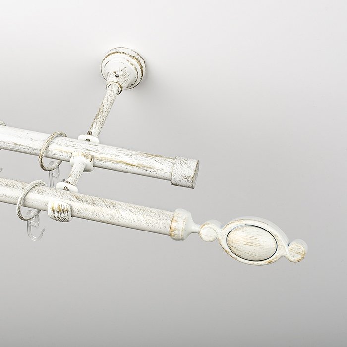 Карниз металлический стыкованный двухрядный. Труба круглая, гладкая, c наконечниками. В комплект входит: Труба ø19 мм – 2 шт. Кронштейн 2-х рядный ø19 мм – 2-3 шт. (в зависимости от длины карниза) Кольцо с крючком для карниза ø 19 мм – 40-64 шт. (в зависимости от длины карниза) Заглушка карниза – 2 шт. Наконечник «Дуо» ø19 мм - 2 шт. Монтажный комплект – 1 шт. Комментарии к товару
