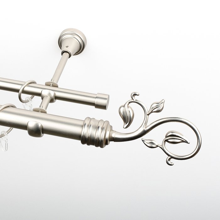 Карниз металлический стыкованный двухрядный с разным диаметром. Труба круглая, гладкая, с наконечниками. В комплект входит: Труба ø16 мм – 1 шт. Труба ø25 мм – 1 шт. Кронштейн 2-х рядный – 2-3 шт. (в зависимости от длины карниза) Кольцо с крючком для карниза – 40-64 шт. (в зависимости от длины карниза) Заглушка карниза – 2 шт. Наконечник «Флора» ø25 мм - 2 шт. Монтажный комплект – 1 шт. Комментарии к товару