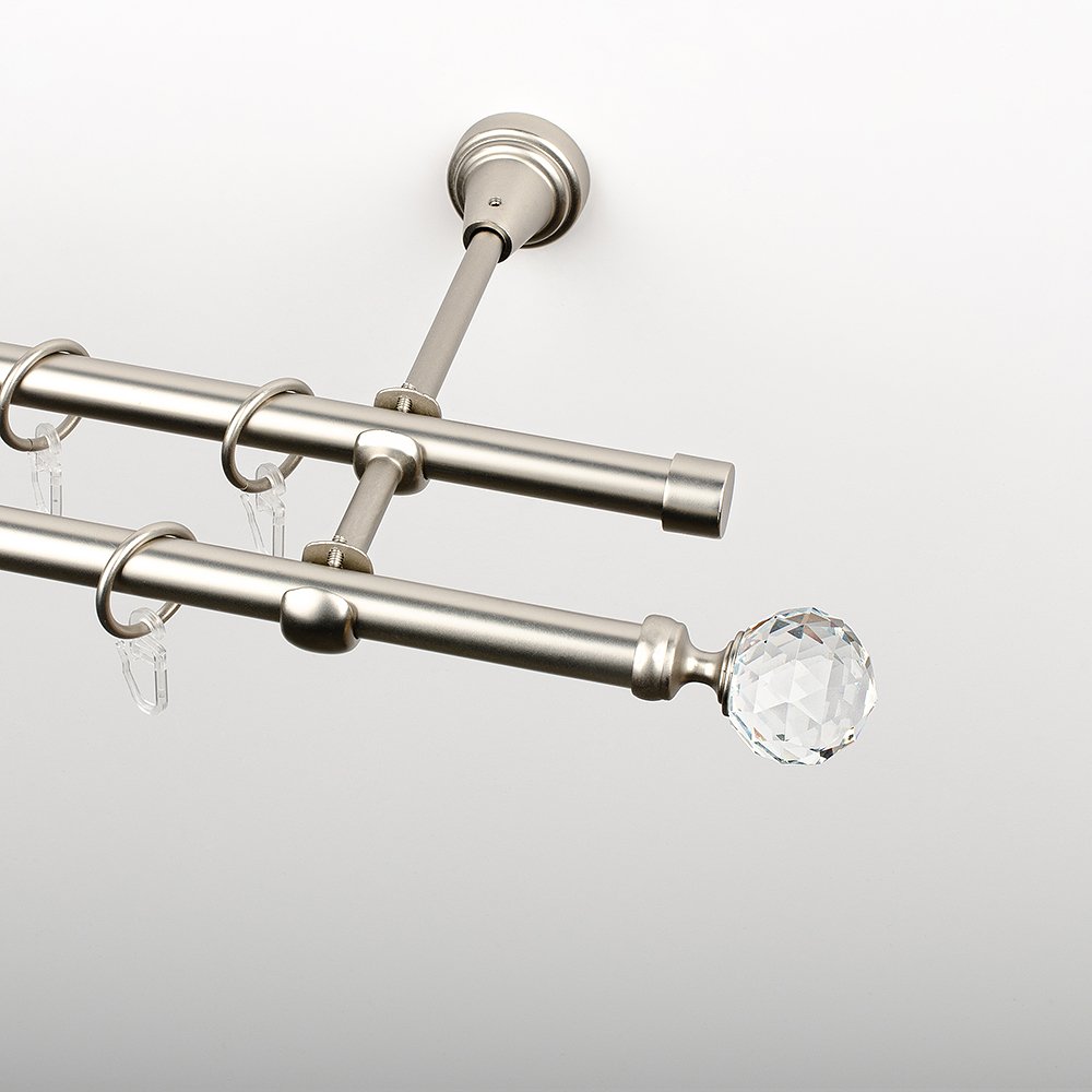 Карниз металлический стыкованный двухрядный. Труба круглая, гладкая, с наконечниками. В комплект входит: Труба ø16 мм – 2 шт. Кронштейн 2-х рядный ø16 мм – 2-3 шт. (в зависимости от длины карниза) Кольцо с крючком для карниза ø 16 мм – 40-64 шт. (в зависимости от длины карниза) Заглушка карниза – 2 шт. Наконечники «Леда» ø16 мм - 2 шт. Монтажный комплект – 1 шт. Комментарии к товару