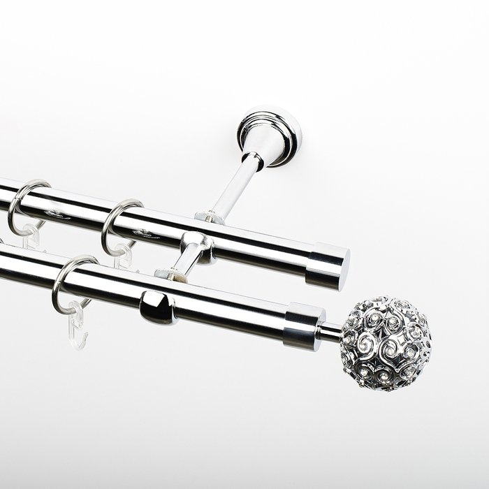 Карниз металлический стыкованный двухрядный. Труба круглая, гладкая, c наконечниками. В комплект входит: Труба ø19 мм – 2 шт. Кронштейн 2-х рядный ø19 мм – 2-3 шт. (в зависимости от длины карниза) Кольцо с крючком для карниза ø 19 мм – 40-64 шт. (в зависимости от длины карниза) Заглушка карниза – 2 шт. Наконечник «Тэтис» ø19 мм - 2 шт. Монтажный комплект – 1 шт. Комментарии к товару