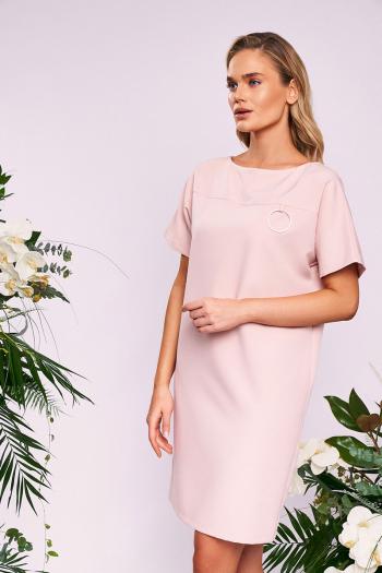 Платье  женское свободного кроя, прямого силуэта с цельнокроеным рукавом. Горловина – лодочка. На левой стороне переда декоративное металлическое кольцо. Спинка с фигурным вырезом, украшена металлическими кольцами.