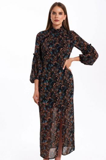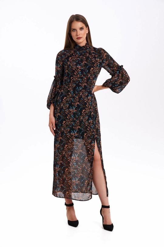 Платье женское малого объёма, прилегающего силуэта. Лиф переда с нагрудными и талиевыми вытачками. Из середины горловины до середины проймы переда проходят фигурные кокетки с притачными рюшами. Лиф спинки с талиевыми вытачками. Передняя и задняя часть юбки с талиевыми вытачками. По переду с левой стороны находится рельеф, который переходит в разрез до линии колена.
