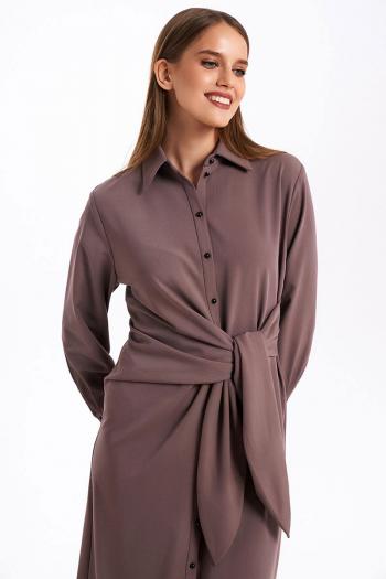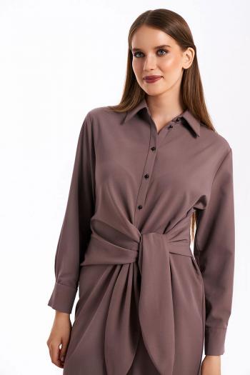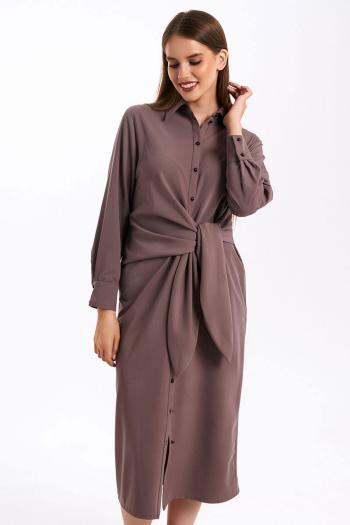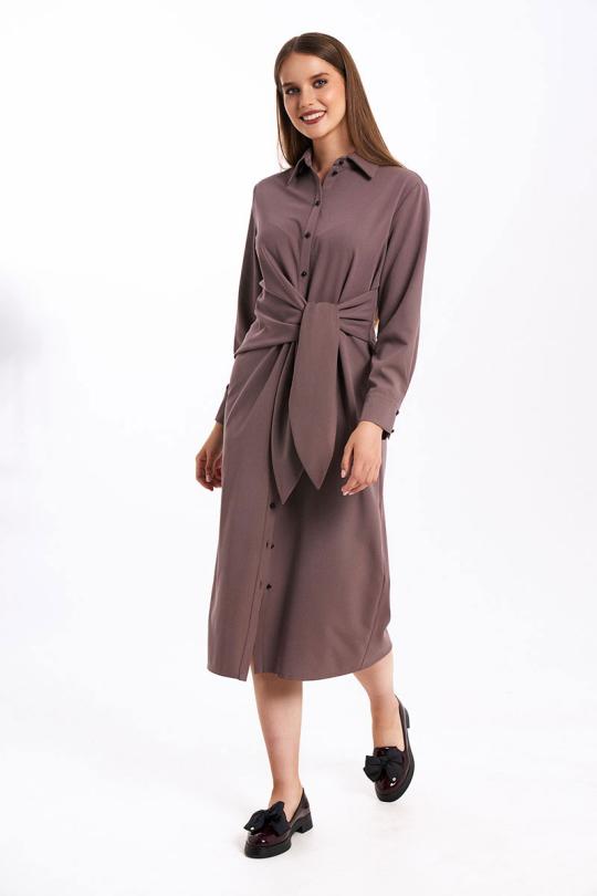 Платье женское прямого силуэта, умеренного объема. Перед ассиметричен. На правой части переда на уровне талии оформлен цельнокроеный пояс. На левой части переда на уровне талии расположена притачная деталь пояса. Спинка разрезная по линии талии, а также имеет 4 талиевые вытачки. Линия плеча чуть спущена. Рукав втачной, длинный. По нижнему срезу рукава притачная манжета с застежкой на петлю и пуговицу. Воротник стояче-отложной рубашечный. Платье длиной ниже линии колена с застежкой на петли и пуговицы.