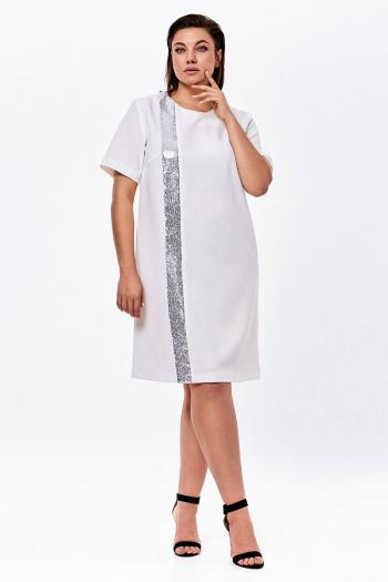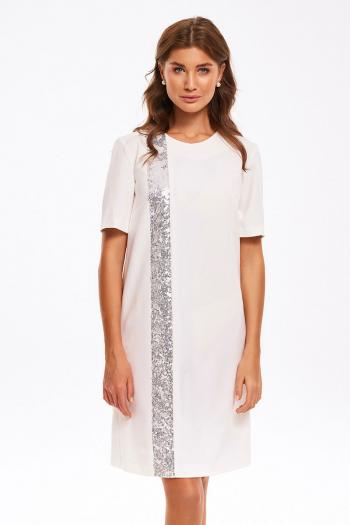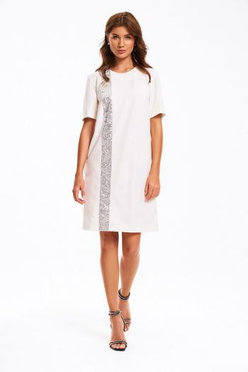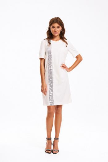 Платье женское умеренного объема, прямого силуэта. Перед с нагрудными вытачкаи и декоративной вертикальной деталью, выполненной из отделочного материала – «пайетки».