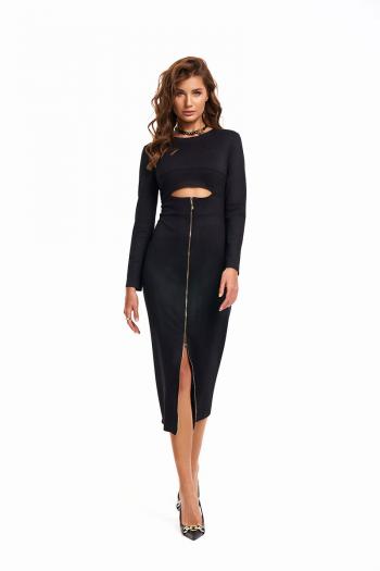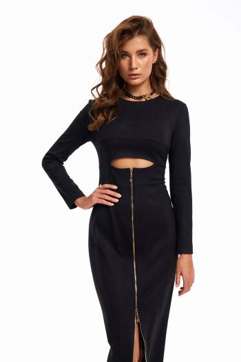 Платье прилегающего силуэта из плотного трикотажного полотна. Небольшой вырез под грудью создаёт эффект топа с юбкой с завышенной талией. Металлическая молния по переду даёт возможность регулировать длину разреза. Застёжка на потайную молнию по спинке.