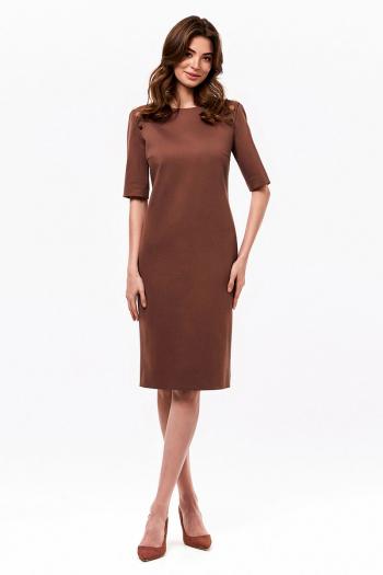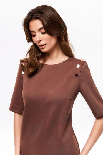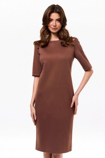 Платье женское из плотного трикотажного полотна, полуприлегающего силуэта, с втачными рукавами и овальной горловиной. Платье с застежкой от горловины на потайную тесьму-молнию в среднем шве спинки. Средний шов спинки заканчивается шлицей. Платье с имитацией пристёгивающихся рукавов в области верхней части оката на металлические пуговицы. Рукава втачные одношовные, длиной до локтя.