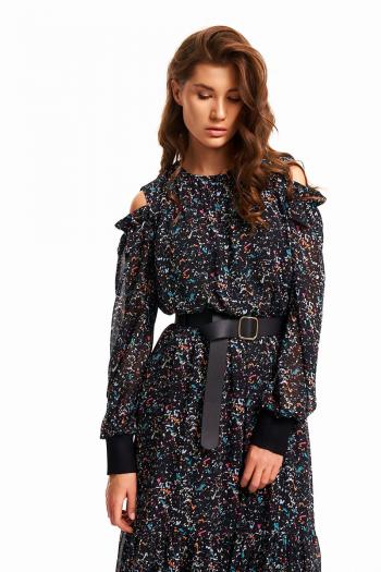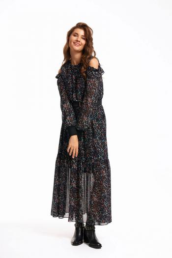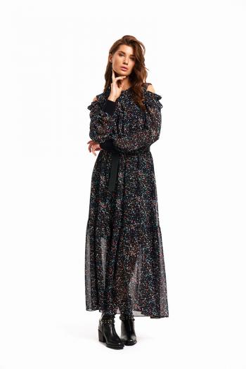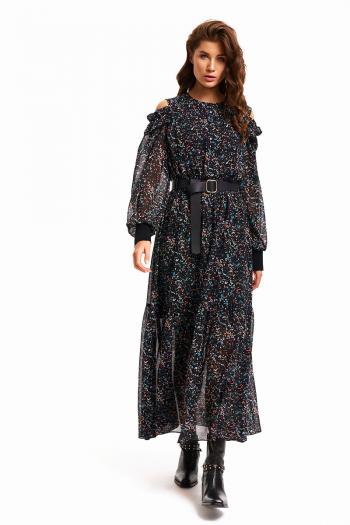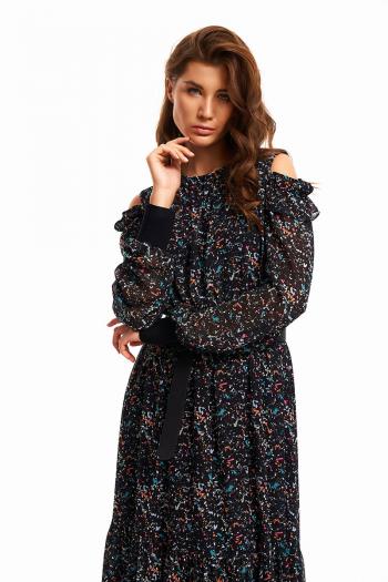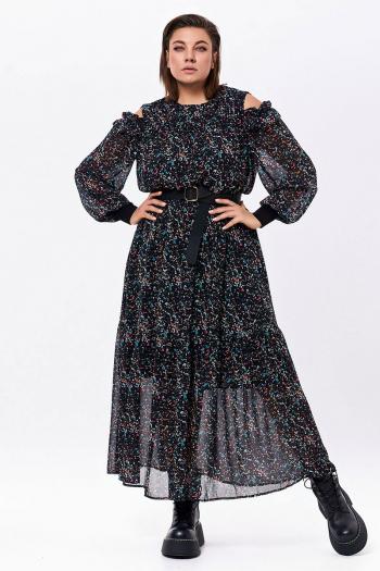 Платье из струящегося шифона длиной maxi на вискозной подкладке. Рукав на трикотажной манжете 9 см. Верх рукава на резинке с рюшей, по плечам небольшие вырезы. По низу изделия притачной волан на сборке. По спинке застёжка на петлю и пуговицу по горловине. Платье на резинке по талии. Комплектуется ремнём.